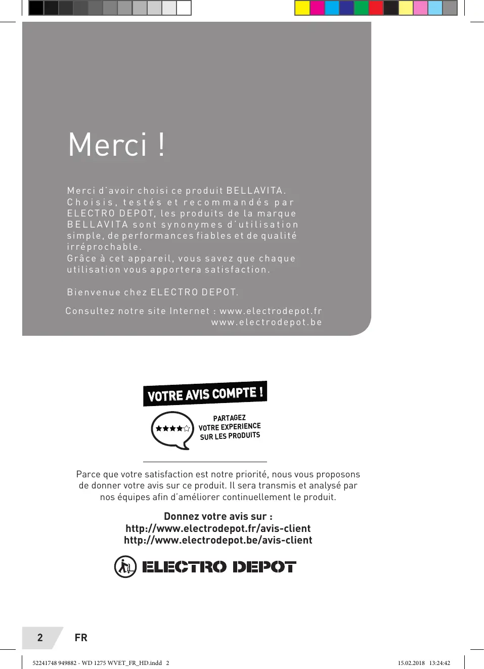 Merci | Merci d'avoir choisi ce produit BELLAVITA. Choisis, testés et recommandés par ELECTRO DEPOT, Les produits de La marque BELLAVITA sont synonymes d'utilisation simple, de performances fiables et de qualité irréprochable Grâce à cet appareil, vous savez que chaque utilisation vous apportera satisfaction. Bienvenue chez ELECTRO DEPOT. Consultez notre site Internet : www.electrodepot.fr www.electrodepot.be VOTRE AVIS COMPTE ! PARTAGEZ VOTRE EXPERIENCE