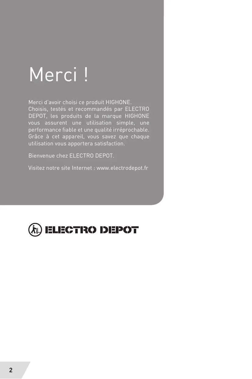 Merci ! Merci d'avoir choisi ce produit HIGHONE. Choisis, testés et recommandés par ELECTRO DEPOT, les produits de La marque HIGHONE vous assurent une utilisation simple, une performance fiable et une qualité irréprochable Grâce à cet appareil, vous savez que chaque utilisation vous apportera satisfaction. Bienvenue chez ELECTRO DEPOT. Visitez notre site Internet : www.electrodepot.fr