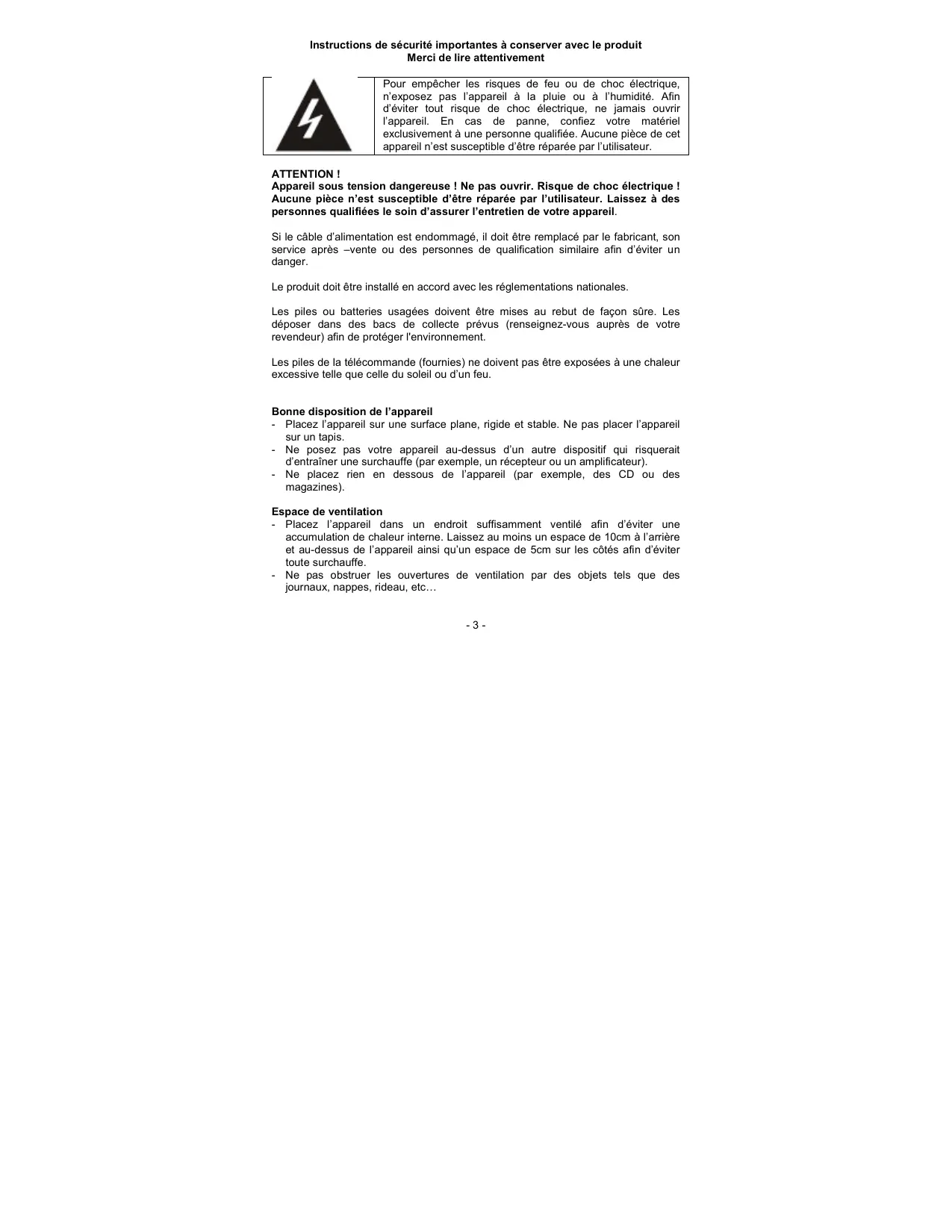 Pour empêcher les risques de feu ou de choc électrique, n'exposez pas l'appareil à la pluie où à l'humidité. Afin d'éviter tout risque de choc électrique, ne jamais ouvrir l'appareil. En cas de panne, confiez votre matériel exclusivement à une personne qualifiée. Aucune pièce de cet appareil n'est susceptible d'être réparée par l'utilisateur.