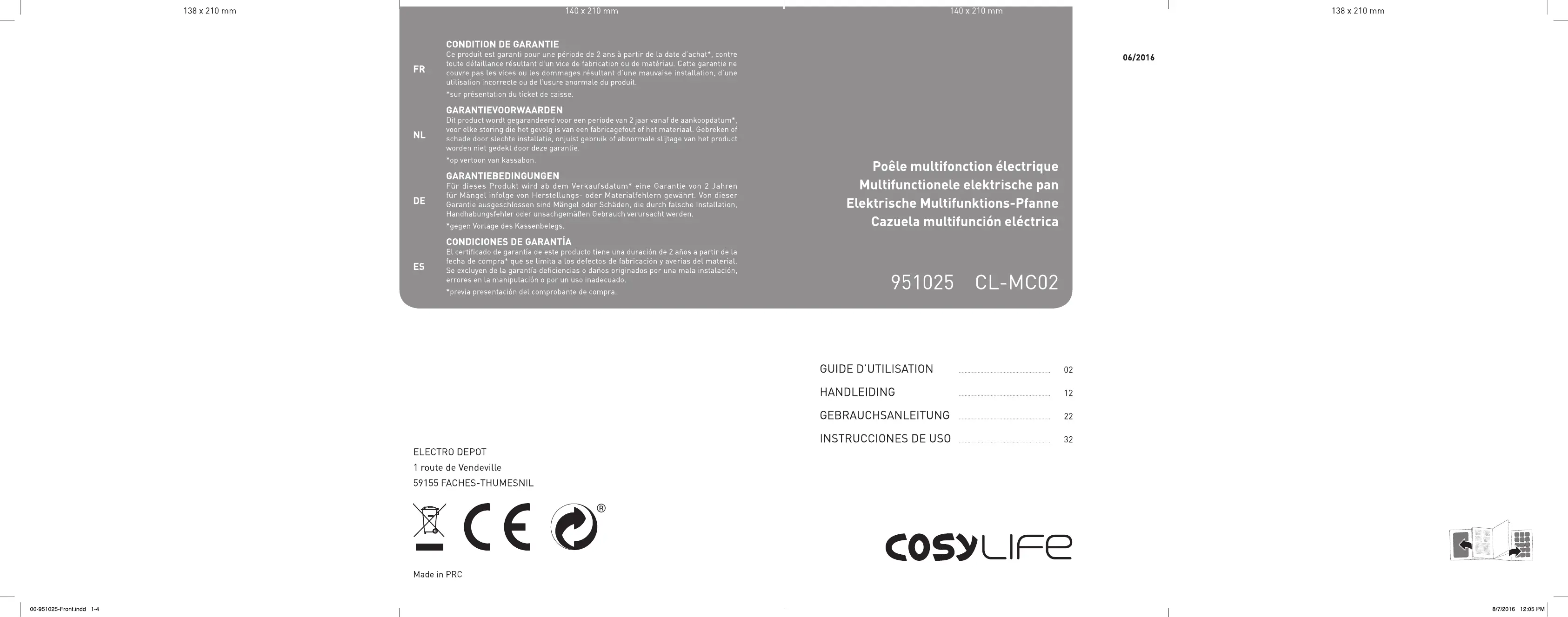 Merci | Merci d'avoir choisi ce produit COSYLIFE. Choisis, testés et recommandés par ELECTRO DEPOT, Les produits de La marque COSYLIFE vous assurent une utilisation simple, une performance fiable et une qualité irréprochable. Grâce à cet appareil, vous savez que chaque utilisation vous apportera satisfaction. Bienvenue chez ELECTRO DEPOT. Visitez notre site Internet : www.electrodepot.fr >TRO DEPOT Size: 140 x 210 mm Les notices sont aussi disponibles sur Le site http://www.electrodepot.fr/sav/notices/ 2 FR 251025-IM-Cooker-VO3-160708 (Multi) indb 2 872016 12:11 PM
