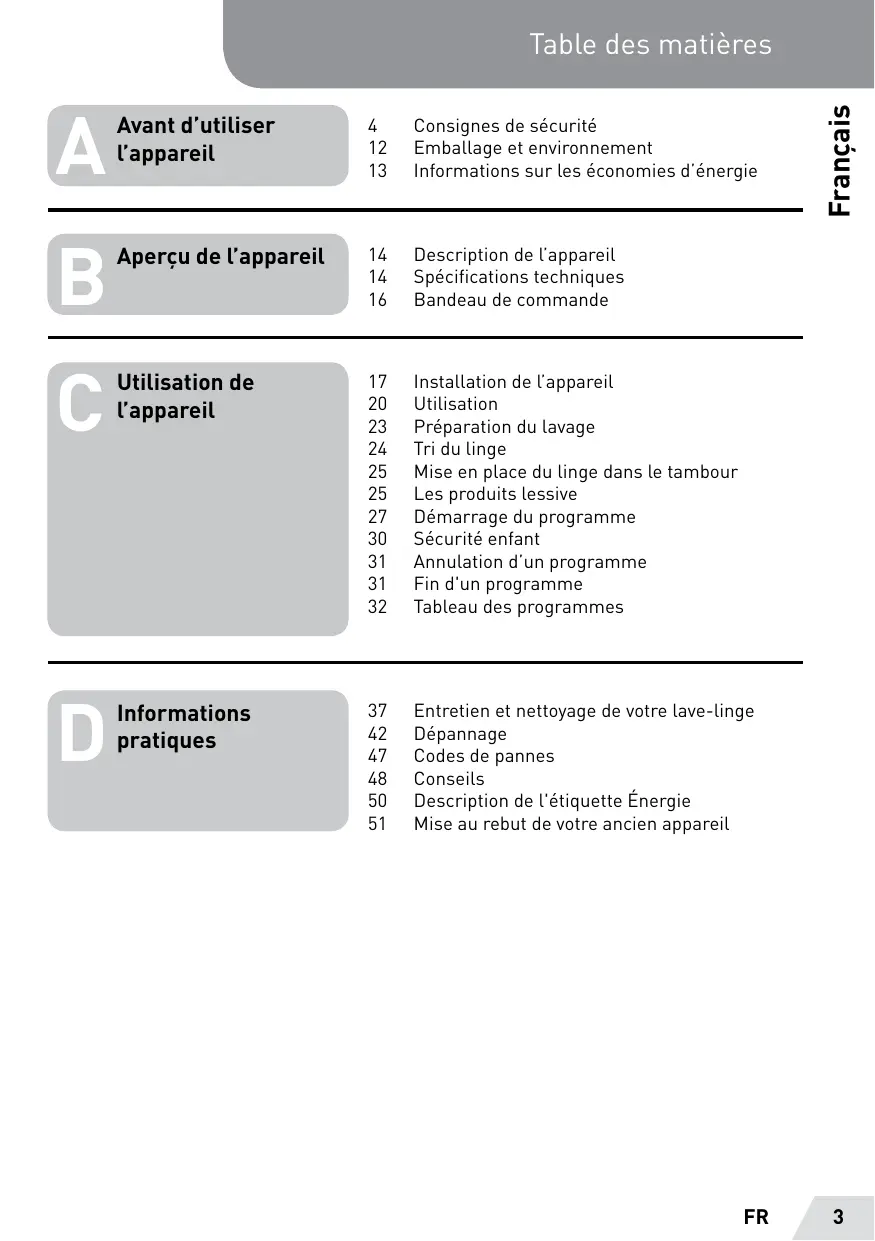 13 Informations sur les économies d'énergie 5 Le LL Aperçu de l'appareil 14 Description de l'appareil 14 Spécifications techniques 16 Bandeau de commande Utilisation de 17 Installation de l'appareil pret 20 Utilisation PP 23 Préparation du lavage 24 Tridulinge 25 Mise en place du linge dans le tambour 25 Les produits lessive 27 Démarrage du programme 30 Sécurité enfant 31 Annulation d'un programme 31 Fin d'un programme 32 Tableau des programmes Ce lave-linge