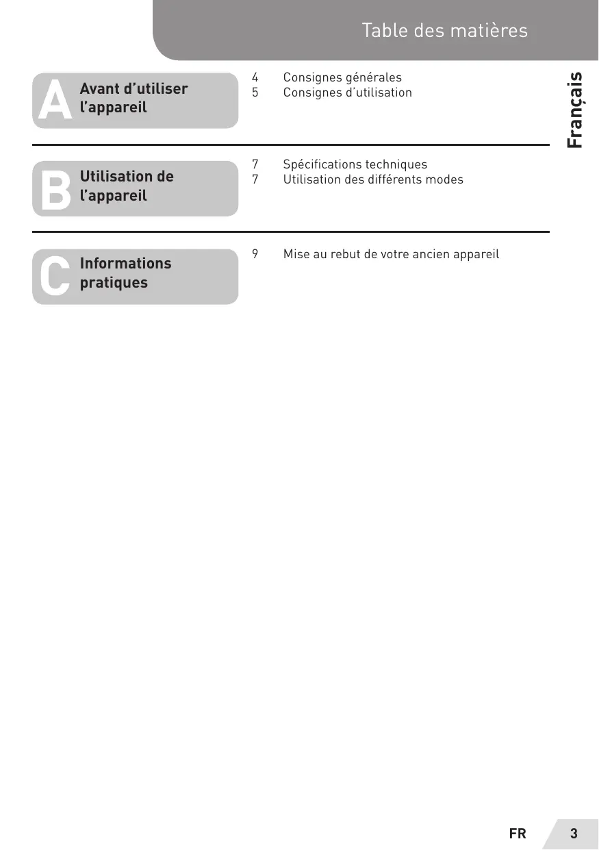 Table des matières Consignes générales Consignes d'utilisation Francais Spécifications techniques Utilisation des différents modes Mise au rebut de votre ancien appareil FR 3