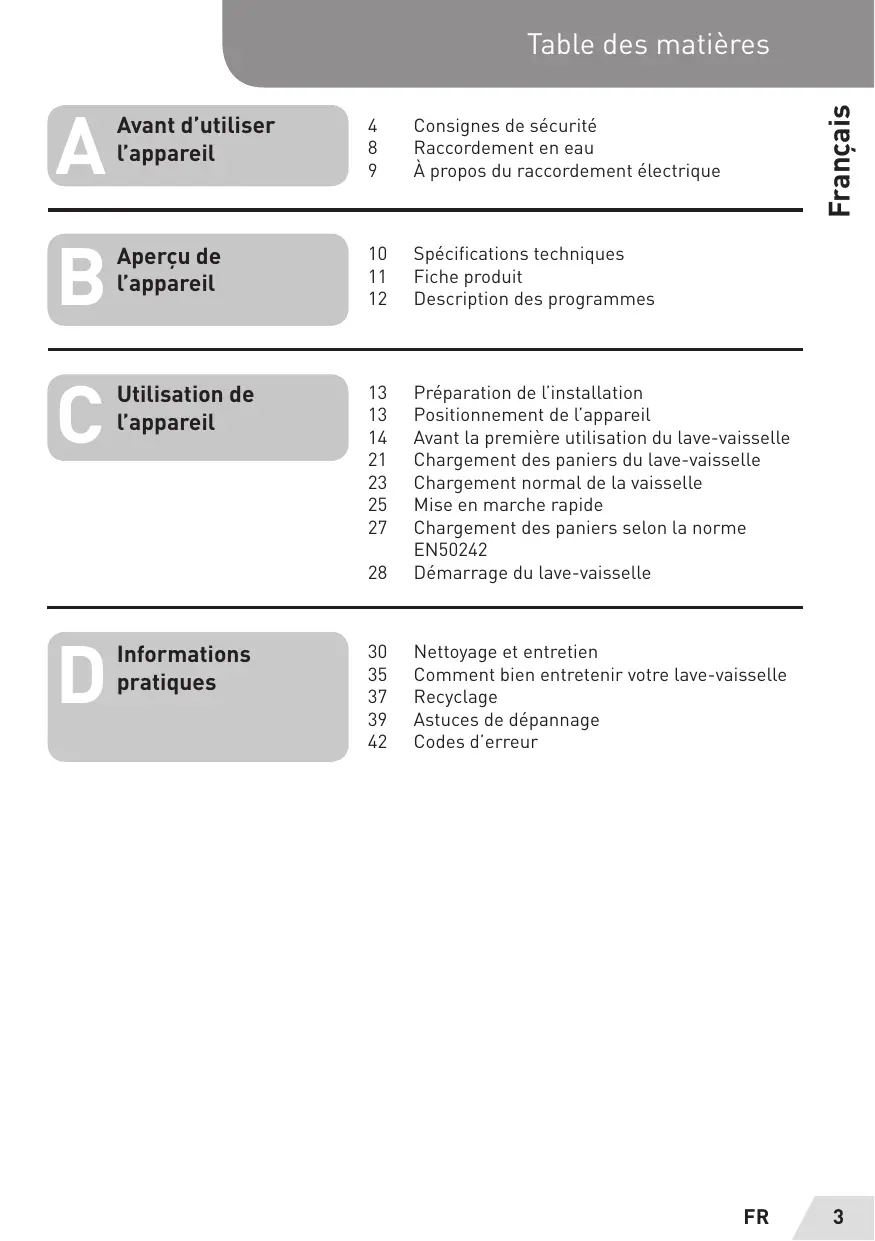 PP 14 Avant la première utilisation du lave-vaisselle 21 Chargement des paniers du lave-vaisselle 23 Chargement normal de la vaisselle 25 Mise en marche rapide 27 Chargement des paniers selon La norme EN50242 28 Démarrage du lave-vaisselle Informations 30 Nettoyage et entretien ñ 35 Comment bien entretenir votre lave-vaisselle ratique: pratiques 37 Recyclage 39 Astuces de dépannage 42 Codes d'erreur