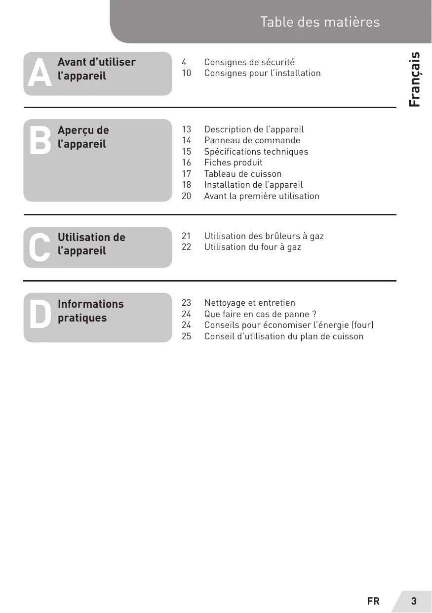 18 Installation de l'appareil 20 Avant la première utilisation Utilisation de 21 Utilisation des brûleurs à gaz l'appareil 22 Utilisation du four à gaz Informations 23 Nettoyage et entretien i 24 Que faire en cas de panne ? ratique: ! panne pratiques 24 Conseils pour économiser l'énergie [four] 25 Conseil d'utilisation du plan de cuisson FR 3