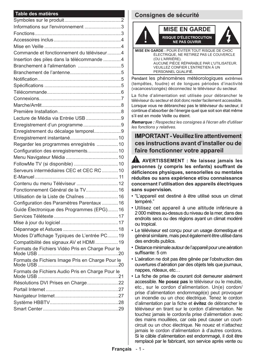 Table des matières Symboles sur le produit Informations sur l'environnement Fonctions . Accessoires inclus … Mise en Veille … Commande et fonctionnement du téléviseui Insertion des piles dans la télécommande Branchement à l'alimentation Branchement de l'antenne... Notification Spécifications Télécommande. Connexions. Marche/Arrê Première Installation. Lecture de Média via Entrée USB Enregistrement d'un programme . Enregistrement du décalage temporel Enregistrement instantané. Regarder les programmes enregistrés Configuration des enregistrements. Menu Navigateur Média FollowMe TV (si disponible) … Serveurs intermédiaires CEC et CEC RC E-Manuel . Contenu du menu Téléviseur Fonctionnement Général de la TV. Utilisation de la Liste de Chaînes … Configuration des Paramètres Parentaux Guide Électronique des Programmes (EPG: Services Télétexte Mise à jour du logiciel Dépannage et Astuces . Modes D'affichage Typiques de L'entrée P Compatibilité des signaux AV et HDMI. Formats de Fichiers Vidéo Pris en Charge Pour le Mode USB 21 Formats de Fichiers Image Pris en Charge Pour le