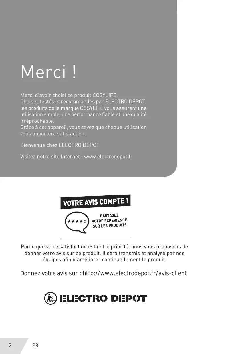 Merci ! Merci d'avoir choisi ce produit COSYLIFE. s et recommandés par ELECTRO DEPO Les produits de la marque COSYLIFE vous assurent une utilisation simple, une performance fiable et une qualité irréprochable. Grâce à cet appareil, vous savez que chaque utilisation vous apportera satisfaction Bienvenue chez ELECTRO DEPOT. Visitez notre site Internet : www.electrodepot.