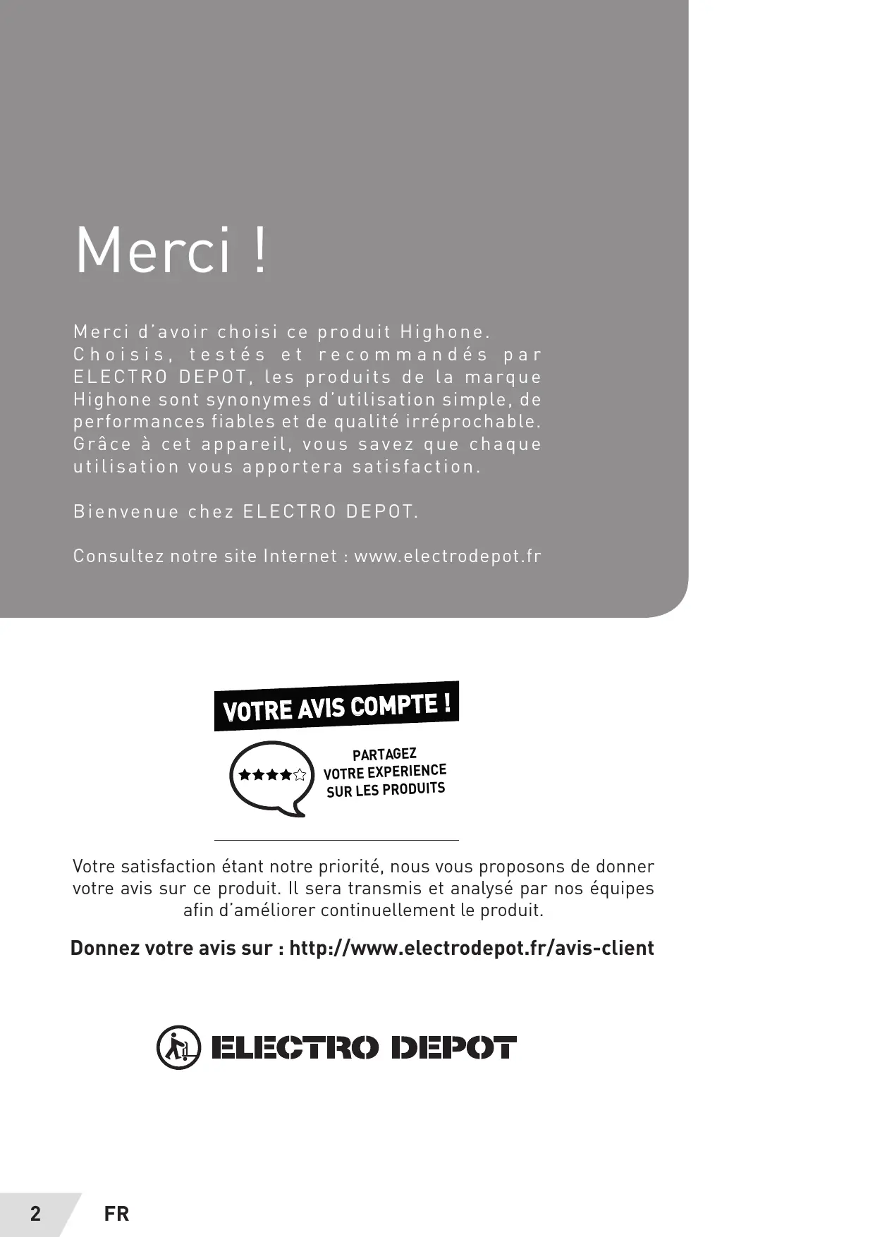 Merci !| Merci d'avoir choisi ce produit Highone. Choisis, testés et recommandés par ELECTRO DEPOT, les produits de La marque Highone sont synonymes d'utilisation simple, de performances fiables et de qualité irréprochable. Grâce à cet appareil, vous savez que chaque utilisation vous apportera satisfaction. Bienvenue chez ELECTRO DEPOT. Consultez notre site Internet : www.electrodepot.fr VOTRE AVIS COMPTE ! PARTAGEZ VOTRE EXPERIENCE