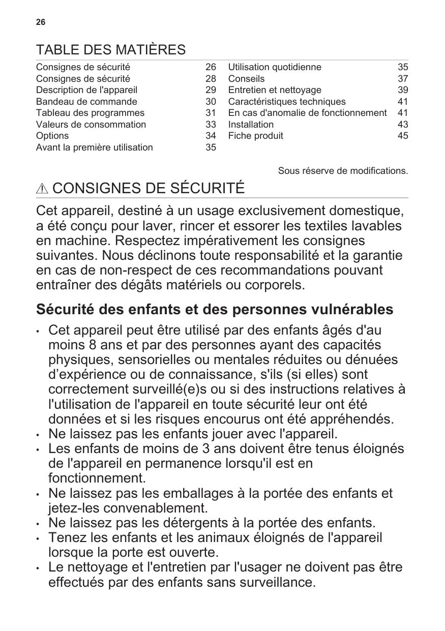 Consignes de sécurité 26 Utilisation quotidienne 35 Consignes de sécurité 28 Conseils 37 Description de l'appareil 29 Entretien et nettoyage 39 Bandeau de commande 30 Caractéristiques techniques 41 Tableau des programmes 31 En cas d'anomalie de fonctionnement 41 Valeurs de consommation 33 Installation 43 Options 34 Fiche produit 45 Avant la première utilisation 35 Sous réserve de modifications.