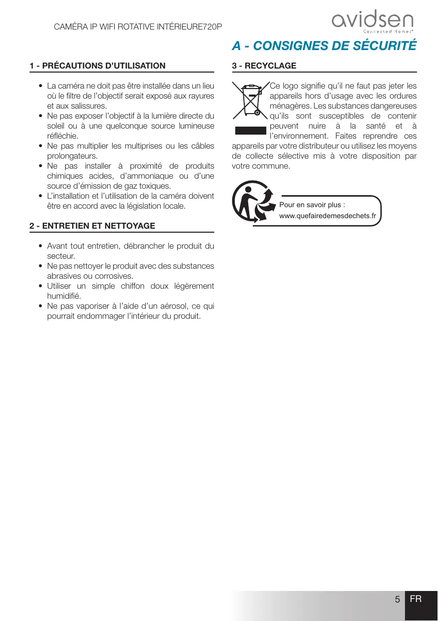 L'installation et l'utilisation de la caméra doivent être en accord avec la législation locale. Pour en savoir plus www.quefairedemesdechets.fr