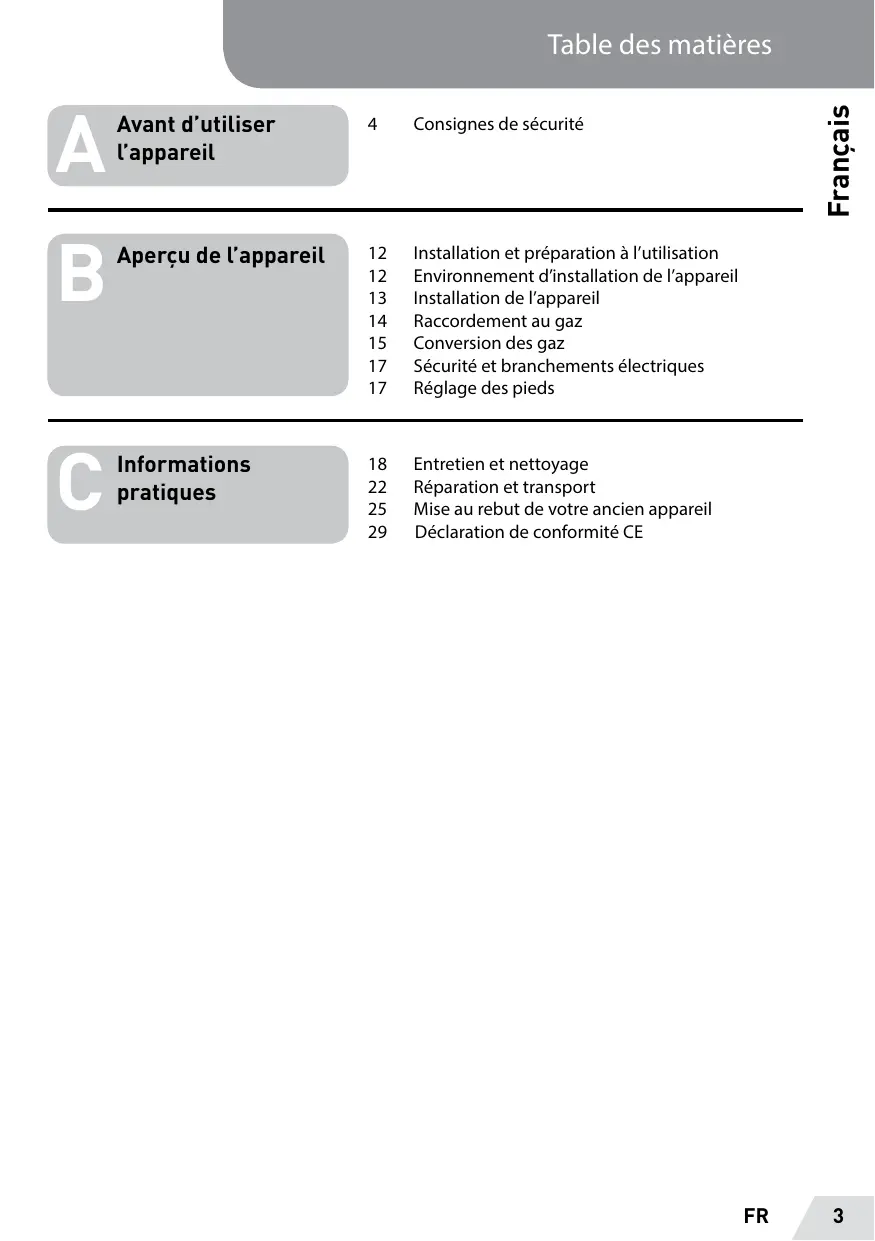 15 Conversion des gaz 17 Sécurité et branchements électriques 17 Réglage des pieds