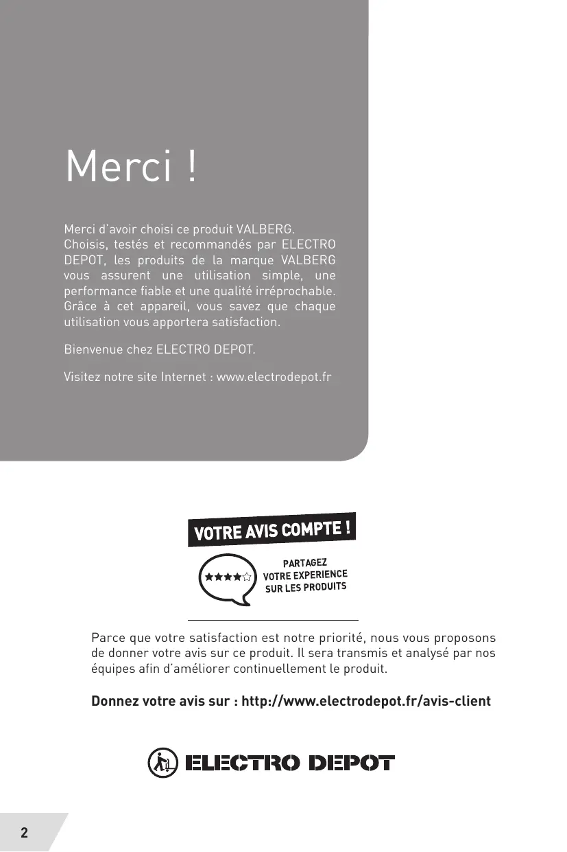 Merci d'avoir choisi ce produit VALBERG. Choisis, testés et recommandés par ELECTRO DEPOT, les produits de la marque VALBERG vous assurent une utilisation simple, une performance fiable et une qualité irréprochable. Grâce à cet appareil, vous savez que chaque utilisation vous apportera satisfaction.
