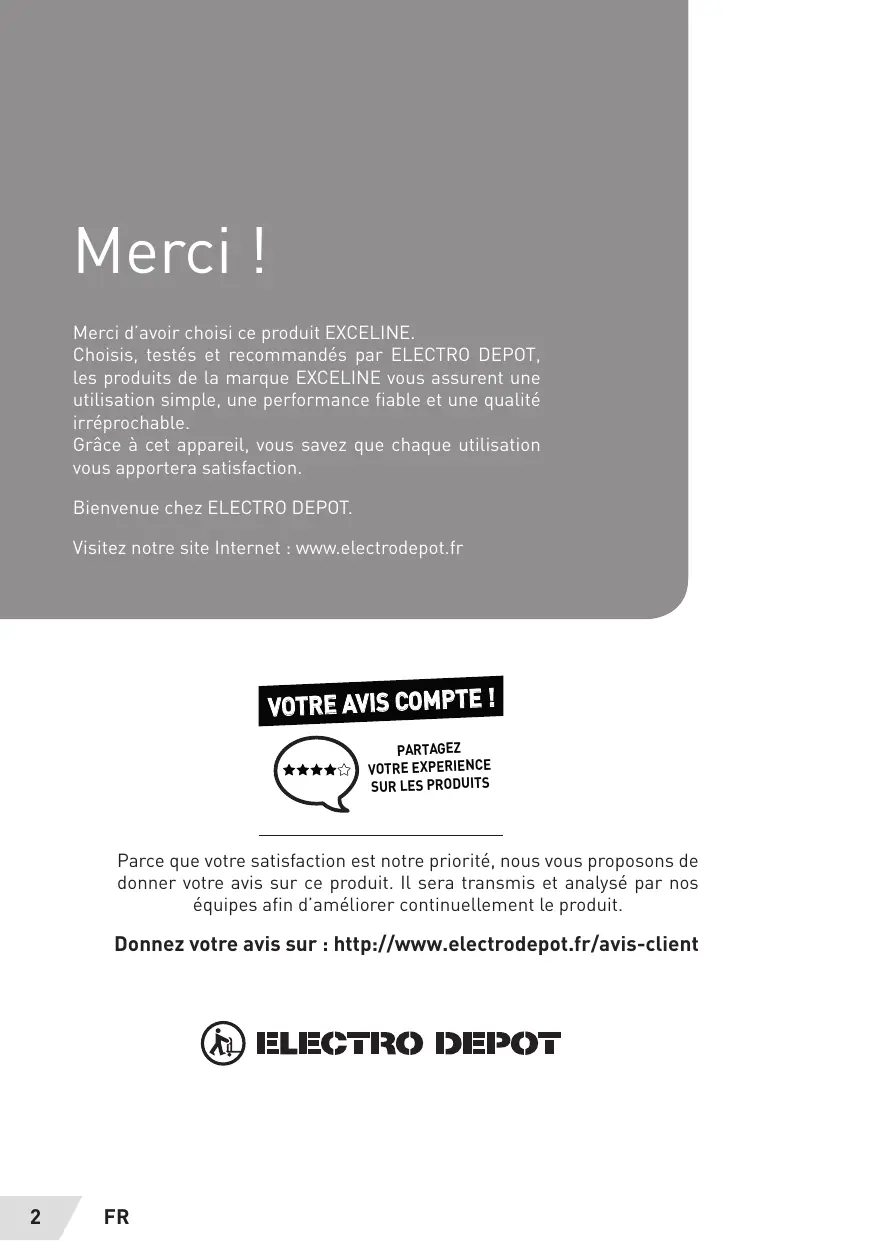 Merci | Merci d'avoir choisi ce produit EXCELINE. Choisis, testés et recommandés par ELECTRO DEPOT, les produits de La marque EXCELINE vous assurent une utilisation simple, une performance fiable et une qualité irréprochable. Grâce à cet appareil, vous savez que chaque utilisation vous apportera satisfaction. Bienvenue chez ELECTRO DEPOT. Visitez notre site Internet : www.electrodepot. VOTRE AVIS COMPTE ! PARTAGEZ VOTRE EXPERIENCE