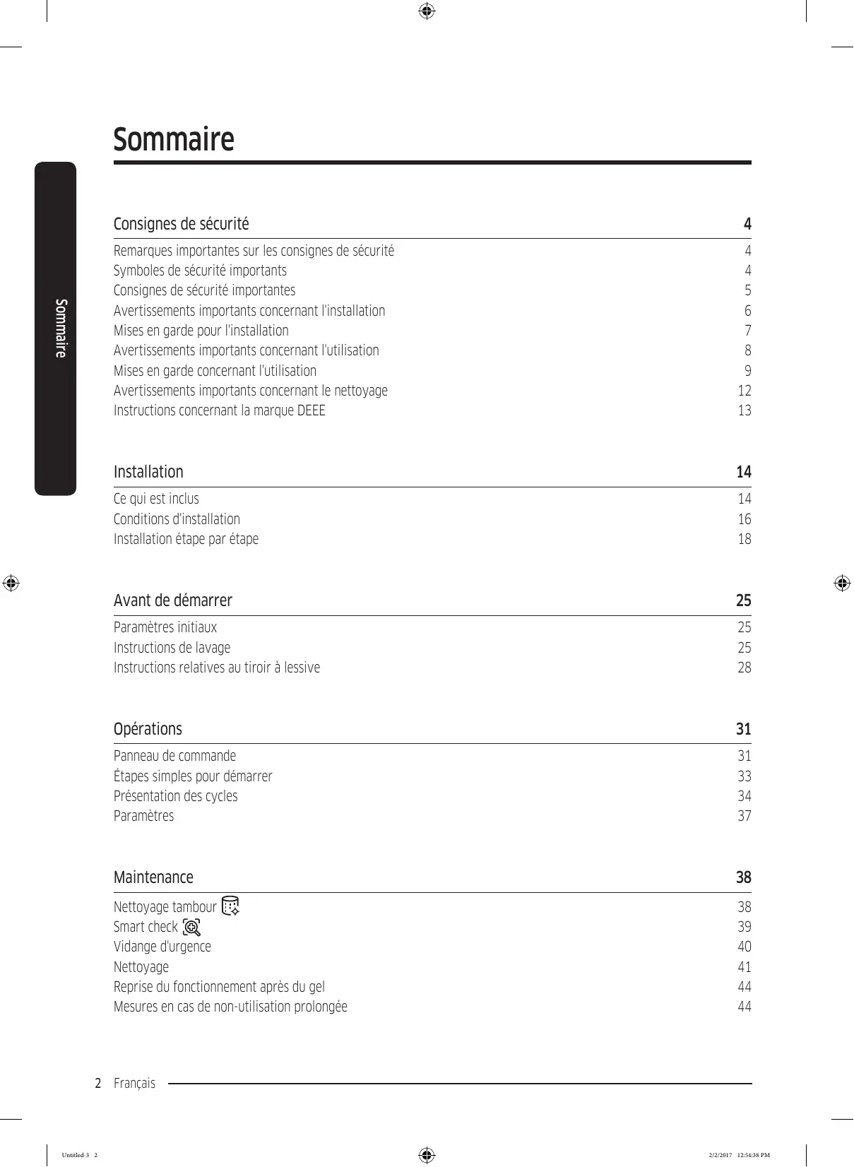 211ELUUUOS 2 Français Sommaire Consignes de sécurité 4 Remarques importantes sur les consignes de sécurité 4 Symboles de sécurité importants 4 Consignes de sécurité importantes 5 Avertissements importants concernant l'installation 6 Mises en garde pour l'installation 7 Avertissements importants concernant l'utilisation 8 Mises en garde concernant l'utilisation 9 Avertissements importants concernant le nettoyage 12 Instructions concernant la marque DEEE 13 Installation 14 Ce qui est inclus 14 Conditions d'installation 16 Installation étape par étape 18 Avant de démarrer 25 Paramètres initiaux 25 Instructions de lavage 25 Instructions relatives au tiroir à lessive 28 Opérations 31 Panneau de commande 31 Étapes simples pour démarrer 33 Présentation des cycles 34 Paramètres 37 Maintenance 38 Nettoyage tamboul 38 Smart check & 39 Vidange d'urgence 40 Nettoyage al Reprise du fonctionnement après du gel 44 Mesures en cas de non-utilisation prolongée 44