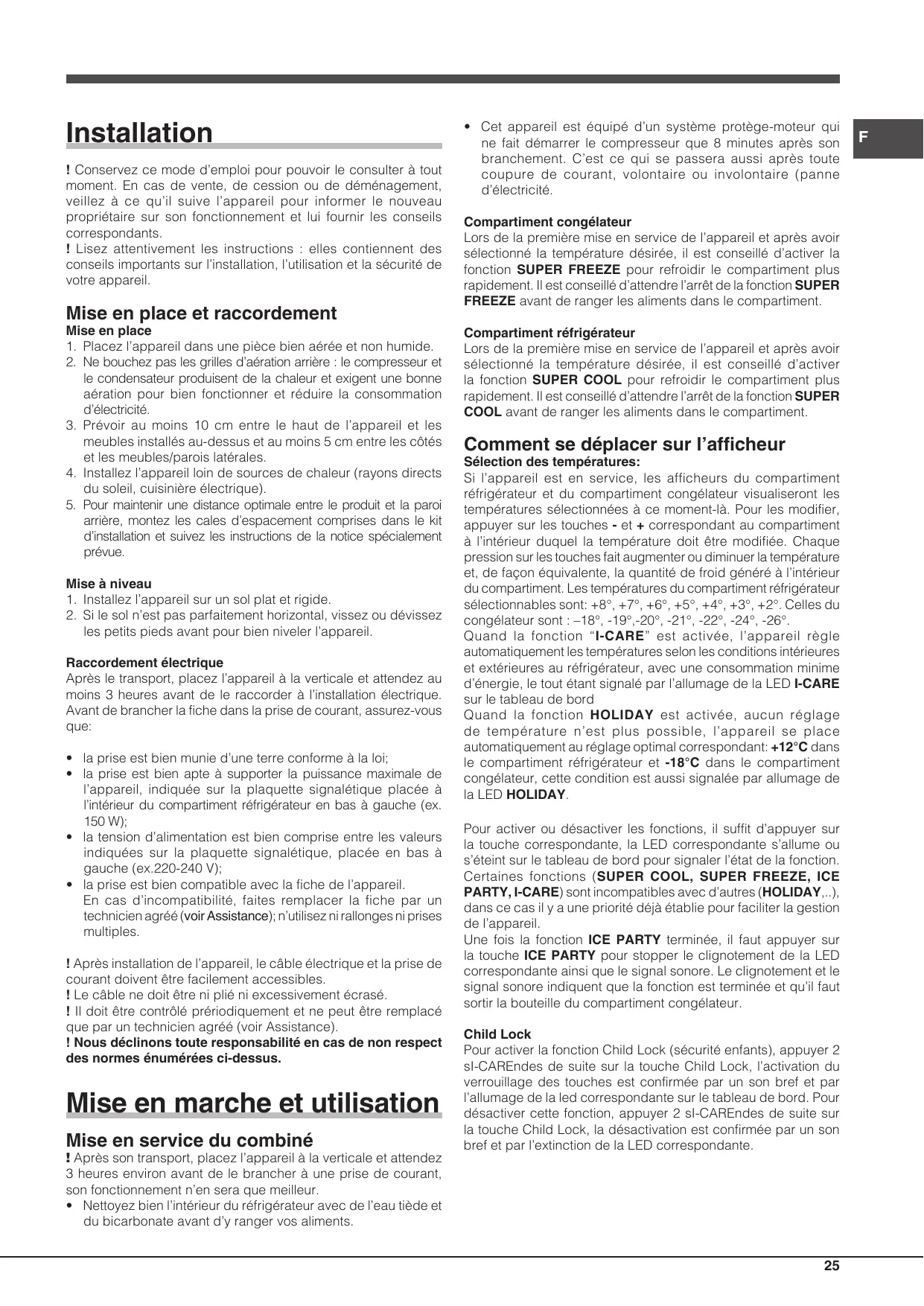 Lors de la première mise en service de l'appareil et après avoir sélectionné la température désirée, il est conseillé d'activer la fonction SUPER FREEZE pour refroidir le compartiment plus rapidement. Il est conseillé d'attendre l'arrêt de la fonction SUPER FREEZE avant de ranger les aliments dans le compartiment.