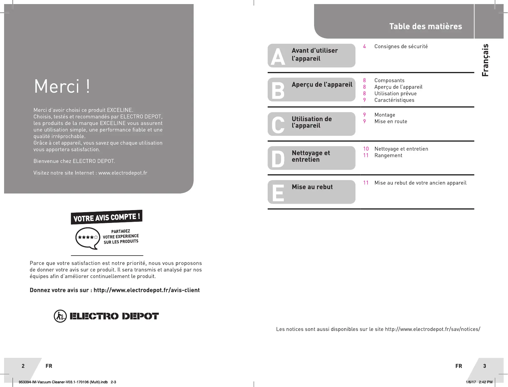 Parce que votre satisfaction est notre priorité, nous vous proposons de donner votre avis sur ce produit. IL sera transmis et analysé par nos équipes afin d'améliorer continuellement Le produit. Donnez votre avis sur : http://www.electrodepot.fr/avis-client @) ELECTRO DEPOT Les notices sont aussi disponibles sur Le site http://www.electrodepot.fr/sav/notices/ 2 FR FR 3 968394-IM-Vacuum Cleaner-V03.1-170106 (Multi) indb 2-3 167 2:42 PM