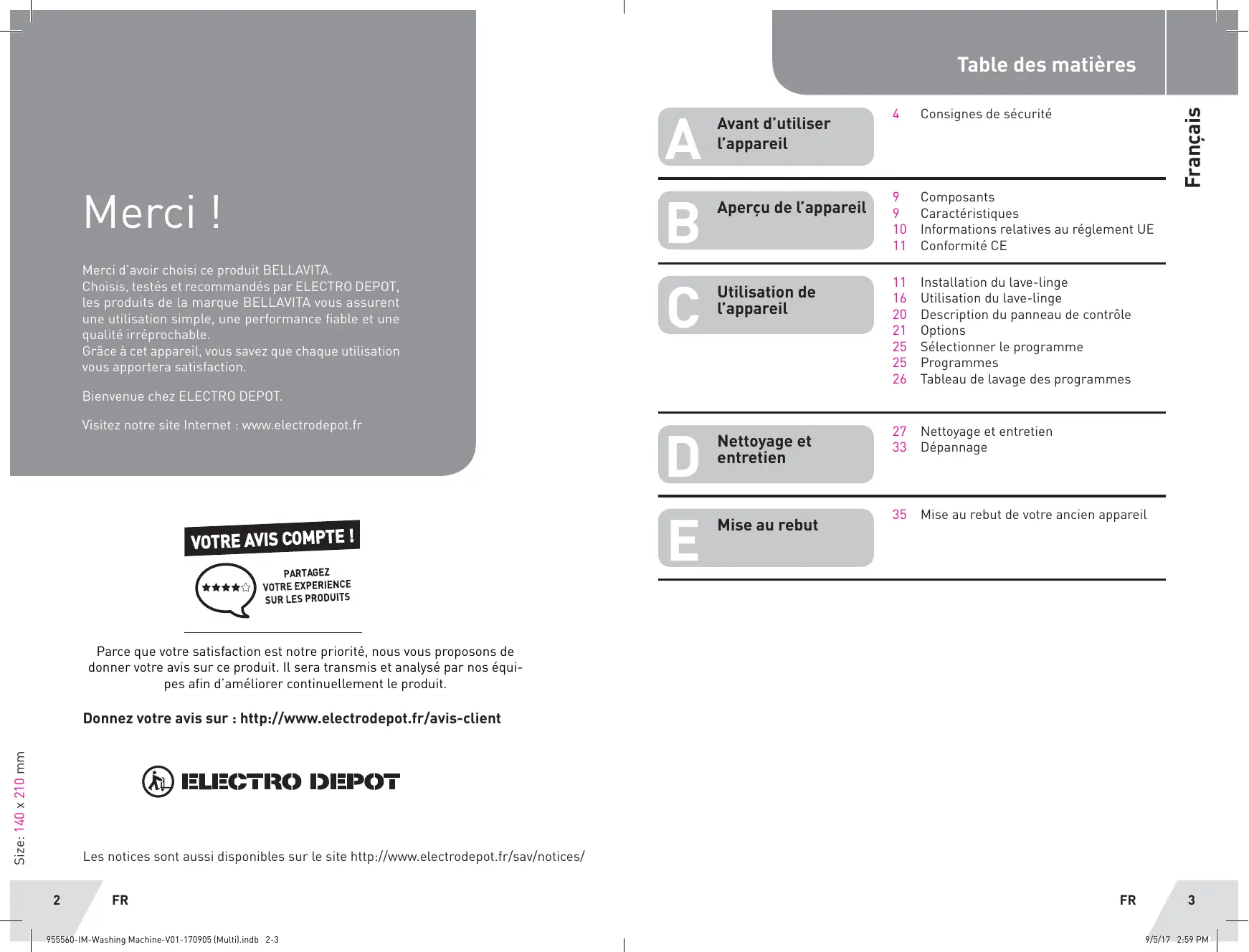 Size: 140 x 210 mm Merci | Merci d'avoir choisi ce produit BELLAVITA. Choisis, testés et recommandés par ELECTRO DEPOT, les produits de la marque BELLAVITA vous assurent une utilisation simple, une performance fiable et une qualité irréprochable. Grâce à cet appareil, vous savez que chaque utilisation vous apportera satisfaction Bienvenue chez ELECTRO DEPOT. Visitez notre site Internet : www.electrodepot.fr VOTRE AVIS COMPTE ! Gus) PARTAGEZ VOTRE EXPERIENCE