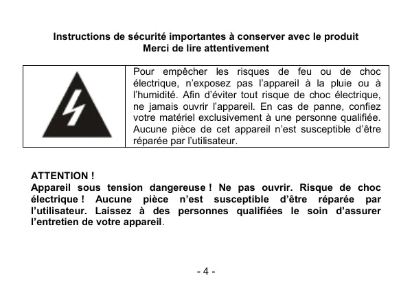 Pour empêcher les risques de feu ou de choc électrique, n'exposez pas l'appareil à la pluie ou à l'humidité. Afin d'éviter tout risque de choc électrique, ne jamais ouvrir l'appareil. En cas de panne, confiez votre matériel exclusivement à une personne qualifiée. Aucune pièce de cet appareil n'est susceptible d'être réparée par l'utilisateur.