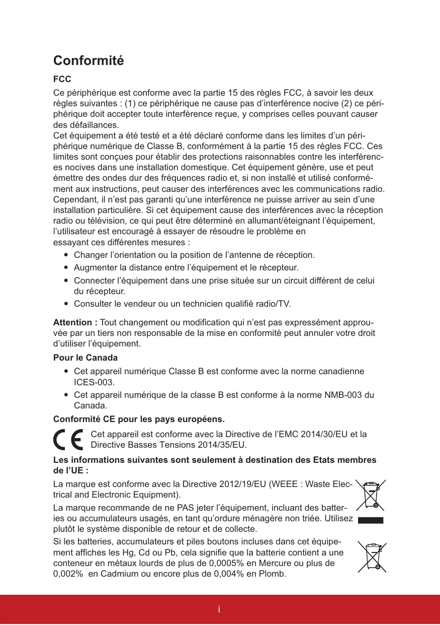 Cependant, il n'est pas garanti qu'une interférence ne puisse arriver au sein d'une installation particulière. Si cet équipement cause des interférences avec la réception radio ou télévision, ce qui peut être déterminé en allumant/éteignant l'équipement, l'utilisateur est encouragé à essayer de résoudre le problème en essayant ces différentes mesures :