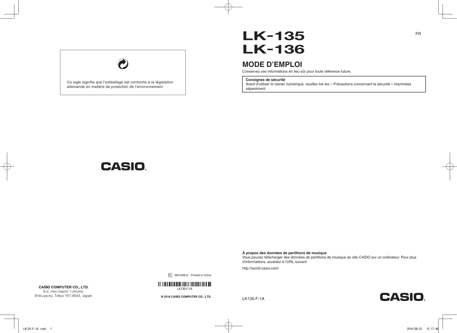 iL Ce sigle signifie que l'emballage est conforme à la législation allemande en matière de protection de l'environnement. CASIO COMPUTER CO. LTD. LE 6-2, Hon-machi 1-chome Shibuya-ku, Tokyo 151-8543, Japan © 2016 CASIO COMPUTER CO. LTD. .