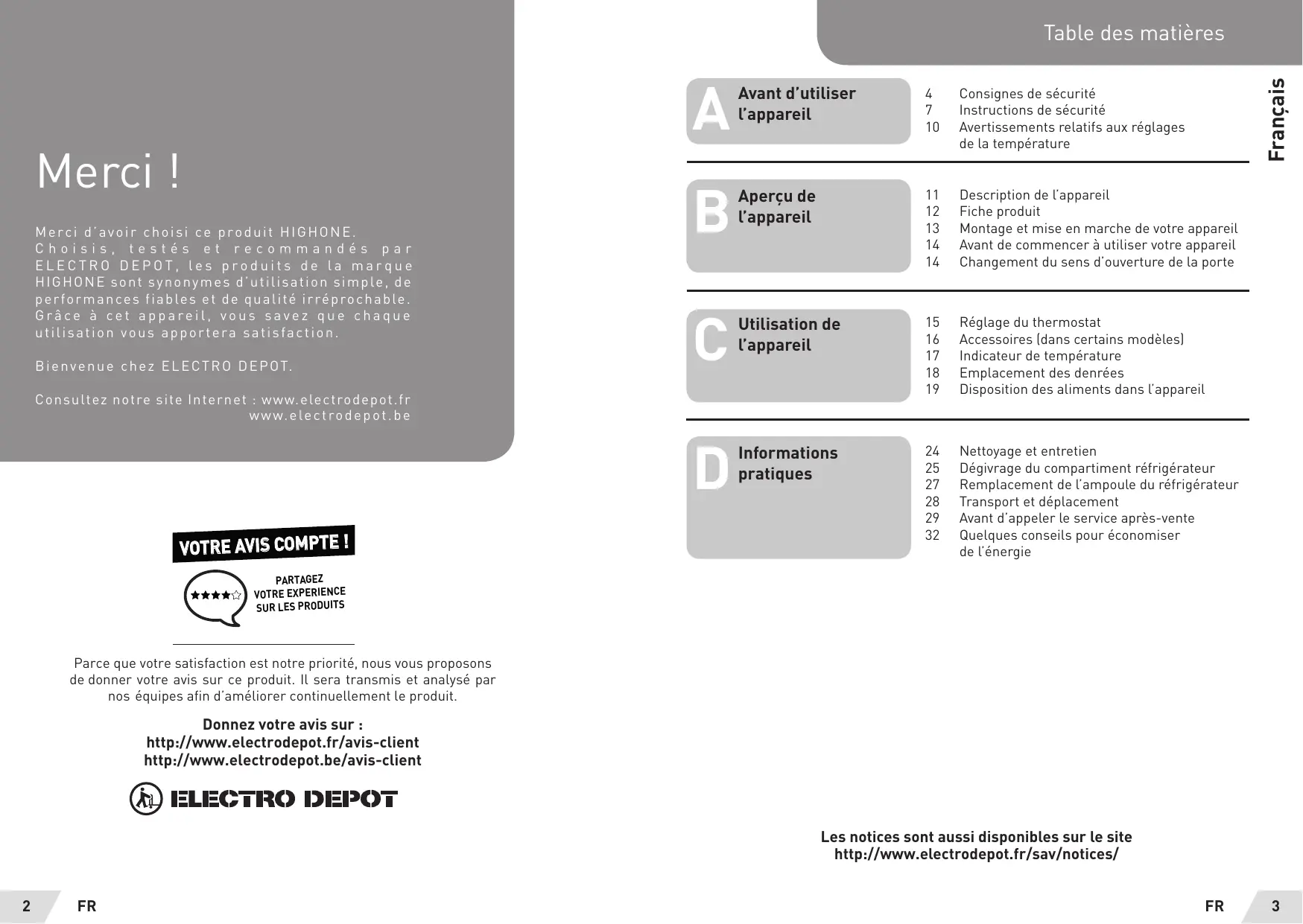 Merci | Merci d'avoir choisi ce produit HIGHONE. Choisis, testés et recommandés par ELECTRO DEPOT, les produits de La marque HIGHONE sont synonymes d'utilisation simple, de performances fiables et de qualité irréprochable. Grâce à cet appareil, vous savez que chaque utilisation vous apportera satisfaction. Bienvenue chez ELECTRO DEPOT. Consultez notre site Internet : www.electrodepot.fr www.electrodepot.be VOTRE AVIS COMPTE ! PARTAGEZ VOTRE EXPERIENCE