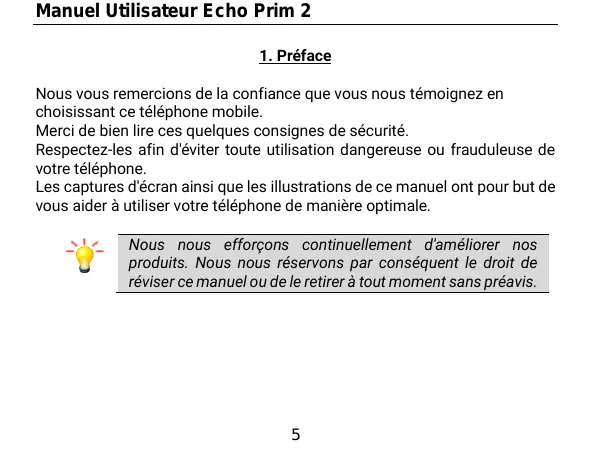 Téléchargez la notice de votre Mobile au format PDF gratuitement ! Retrouvez votre notice Prim2 1,77 - ECHO et reprennez votre appareil électronique en main. Sur cette page sont publiés tous les documents nécessaires à l'utilisation de votre appareil Prim2 1,77 de la marque ECHO.