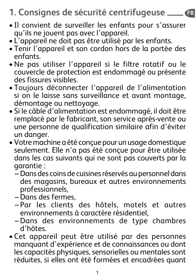 relatives à l’utilisation de l'appareil en toute sécurité leur ont été données et si les risques encourus ont été appréhendés. Le nettoyage et l’entretien par l'utilisateur ne doit pas être fait par des enfants à moins qu'ils soient âgés d’au moins 8 ans et supervisés. Tenir l’appareil et son cordon hors de la portée des enfants de moins de 8 ans. + Vérifiez toujours le filtre avant utilisation. « N'utilisez jamais la centrifugeuse si le filtre est cassé, s'il est défectueux, si vous voyez des craquelures, fêlures ou si le filtre est déchiré. Si le filtre est visiblement détérioré, contactez un Centre de service agréé. Les bords du filtre sont coupants : manipulez-le avec précaution. + Pour votre sécurité, cet appareil est compatible avec les normes et les réglementations suivantes : — Directive basse tension — Directive sur la compatibilité électromagnétique — Réglementations relatives aux matériaux destinés au contact alimentaire. + Vérifiez que la tension indiquée sur la plaque des caractéristiques électriques de l'appareil correspond bien à celle de votre installation électrique. Toute erreur de branchement annule la garantie. + Ne posez ou n’utilisez jamais cet appareil sur une plaque chauffante ou à proximité d'une flamme (cuisinière à gaz). + N'immergez jamais le bloc moteur dans l’eau et ne le passez pas sous l’eau courante. - N'utilisez cet appareil que sur un plan de travail solide, stable et à l'abri des projections d'eau. Ne retournez pas l'appareil. + Toute intervention autre que le nettoyage et l'entretien usuel par le client doit être effectué par un centre agréé. + Ne jamais débrancher l'appareil en tirant sur le cordon. < N'utilisez un prolongateur qu'après avoir vérifié que celui-ci est en parfait état. + Un appareil électroménager ne doit pas être utilisé : — S'il est tombé par terre — S'il est endommagé ou s’il est incomplet. + Dans ces cas, comme pour toute réparation, vous devez contacter votre centre de service agréé. + Cet appareil est exclusivement destiné à un usage domestique. Le fabricant décline toute responsabilité et se réserve le droit de résilier la garantie en cas d'utilisation commerciale ou inadaptée, ou de non-respect des instructions du mode d'emploi.