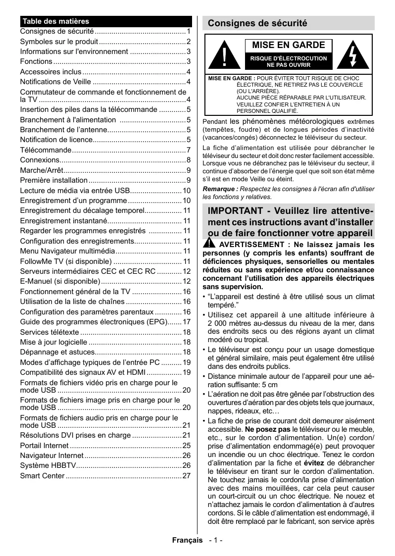 Table des matières Consignes de sécurité … Symboles sur le produit. Informations sur l'environnement Fonctions Accessoires inclus Notifications de Veille Commutateur de commande et fonctionnement de la TV 4 Insertion des piles dans la télécommande 5 Branchement à l'alimentation 5 Branchement de l'antenne. 5 Notification de licence. 5 Télécommande...T Connexions. 8