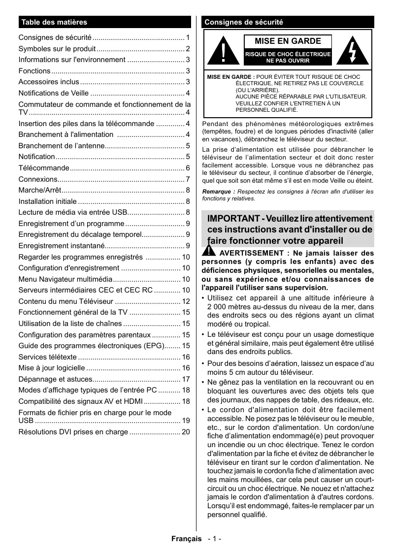 Télécommande. Utilisation de la liste de chaînes . Configuration des paramètres parentaux Guide des programmes électroniques (EPG) 15 Services télétexte Mise à jour logicielle . Dépannage et astuces. Modes d'affchage typiques de l'entrée PC. Compatibilité des signaux AV et HDMI...