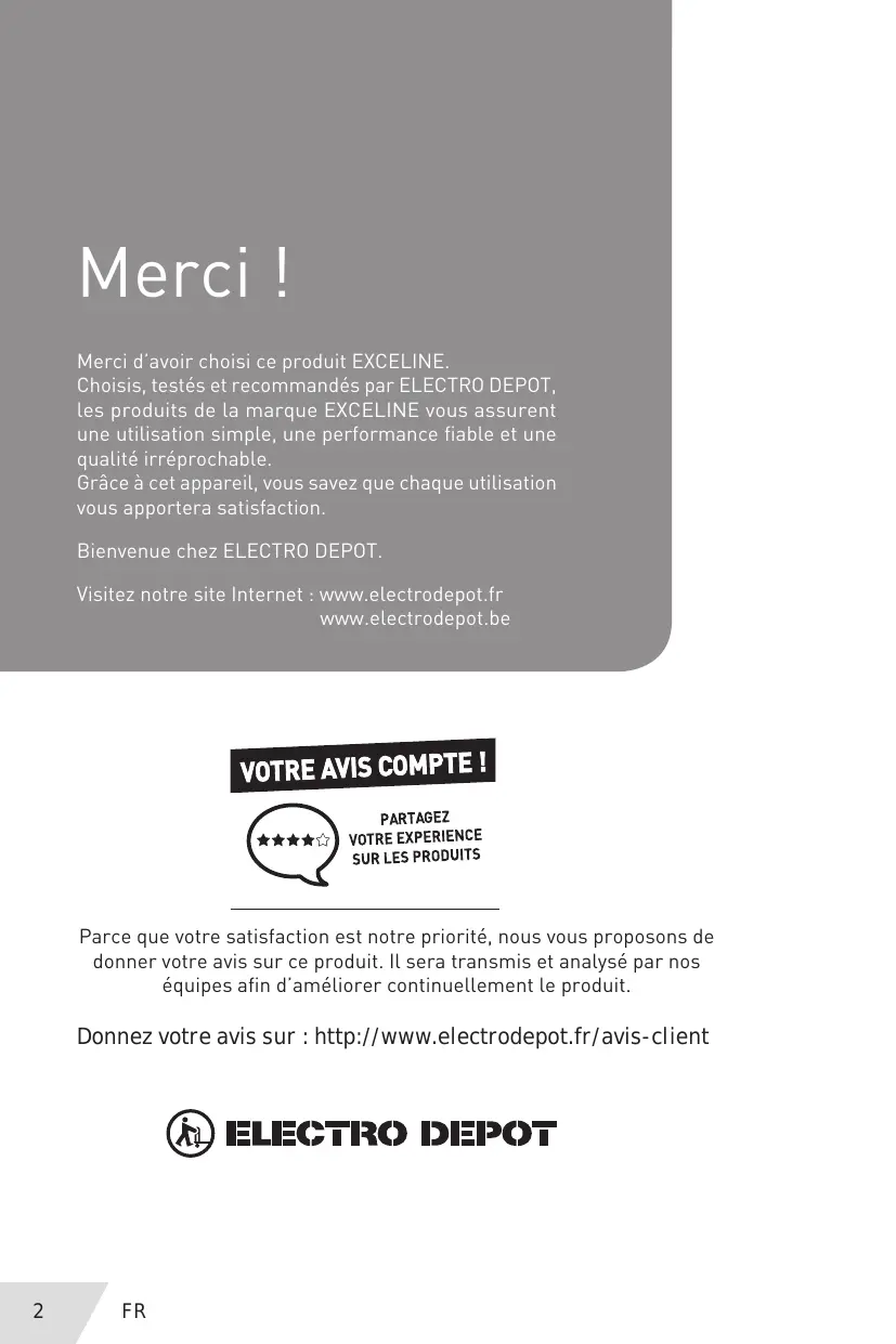 Merci ! Merci d'avoir choisi ce produit EXCELINE. s et recommandés par ELECTRO DEPOT, les produits de la marque EXCELINE vous assurent une utilisation simple, une performance fiable et une qualité irréprochable. Grâce à cet appareil, vous savez que chaque utilisation vous apportera satisfaction Bienvenue chez ELECTRO DEPOT. Visitez notre site Internet : www.electrodepot. www.electrodepot.be