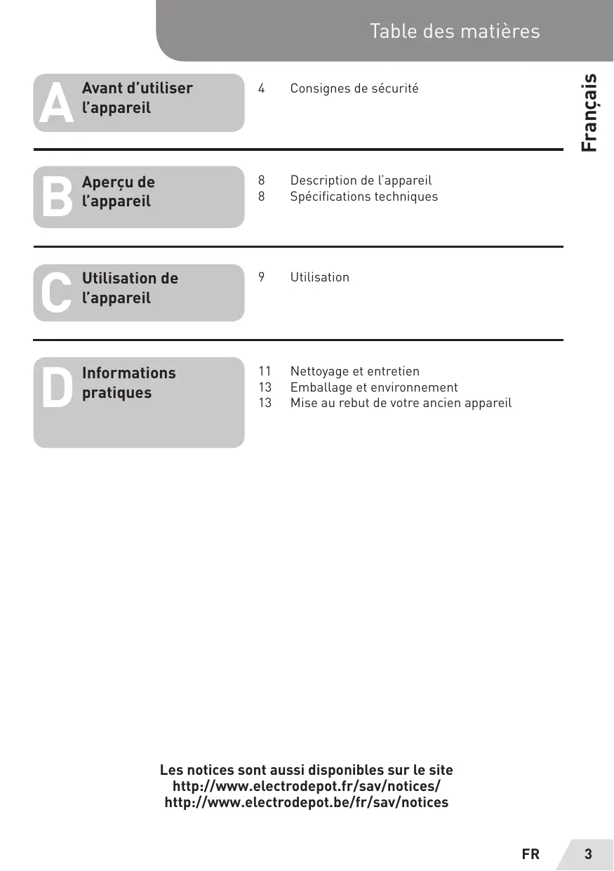 Table des matières Avant d'utiliser 4 Consignes de sécurité l'appareil Aperçu de 8 Description de l'appareil l'appareil 8 Spécifications techniques Utilisation de 9 Utilisation l'appareil Informations 11. Nettoyage et entretien ï 13 Emballage et environnement CICHRTES 13 Mise au rebut de votre ancien appareil Les notices sont aussi disponibles sur Le site http://www.electrodepot.fr/sav/notices/ http://www.electrodepot.be/fr/sav/notices
