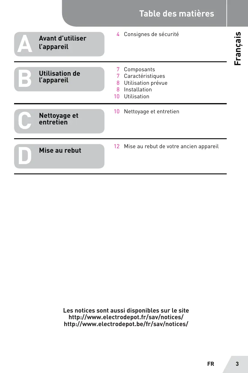 ilisati 7 Composants DARÉENE de 7 Caractéristiques appare! 8 Utilisation prévue 8 Installation 10 Utilisation Nettoyage et 10 Nettoyage et entretien entretien A 12 Mise au rebut de votre ancien appareil Mise au rebut pp Les notices sont aussi disponibles sur Le site http://www.electrodepot.fr/sav/notices/ http://www.electrodepot.be/fr/sav/notices/ FR 3