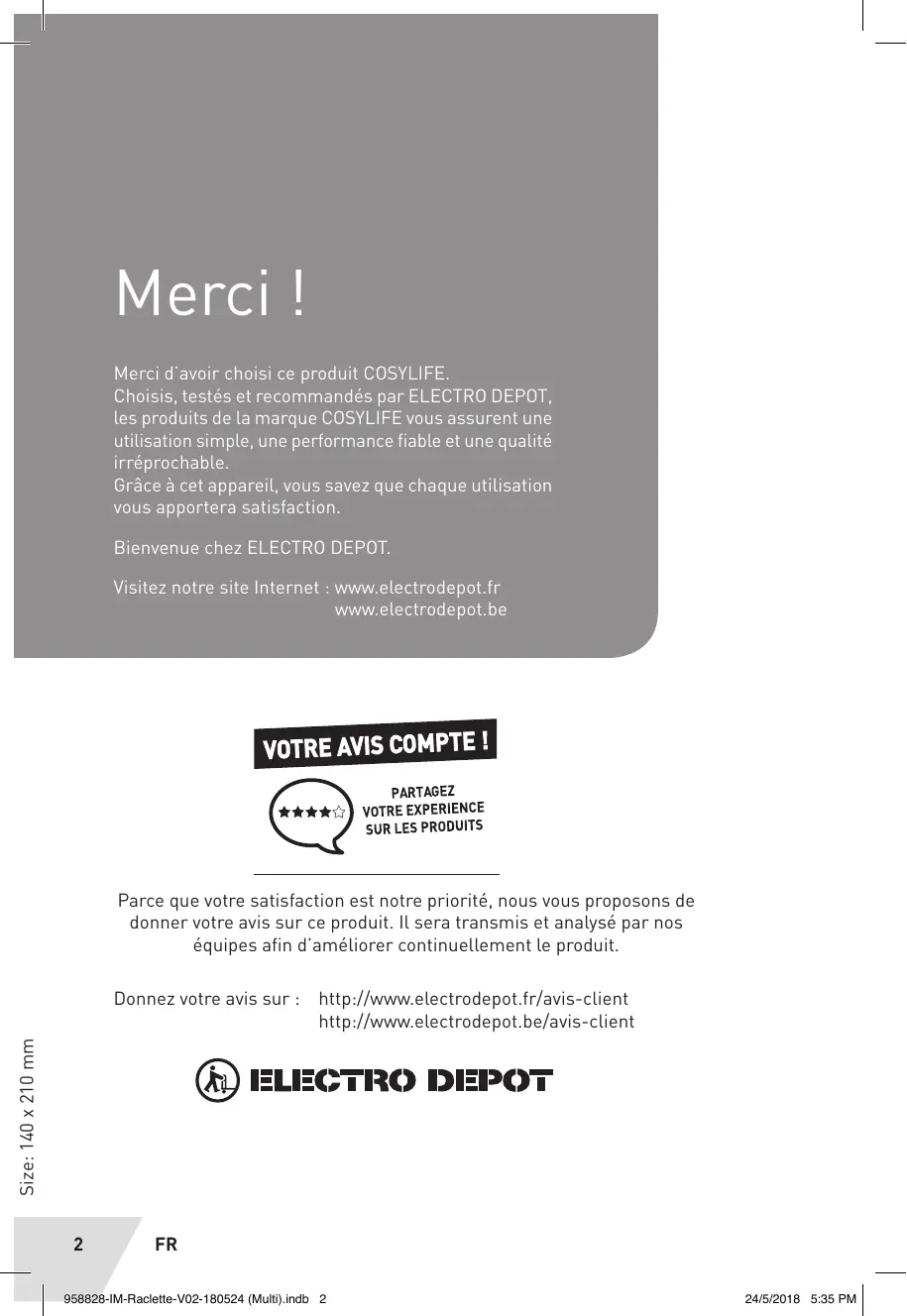 Parce que votre satisfaction est notre priorité, nous vous proposons de donner votre avis sur ce produit. || sera transmis et analysé par nos équipes afin d'améliorer continuellement Le produit. Donnez votre avis sur: http://www.electrodepot.fr/avis-client http:/Awww.electrodepot.be/avis-client TRO DEPOT Size: 140 x 210 mm 2 FR 258828-IM-Raclette-VO2-180524 (Mult).indb 2 2AISI2018 5:36 PM