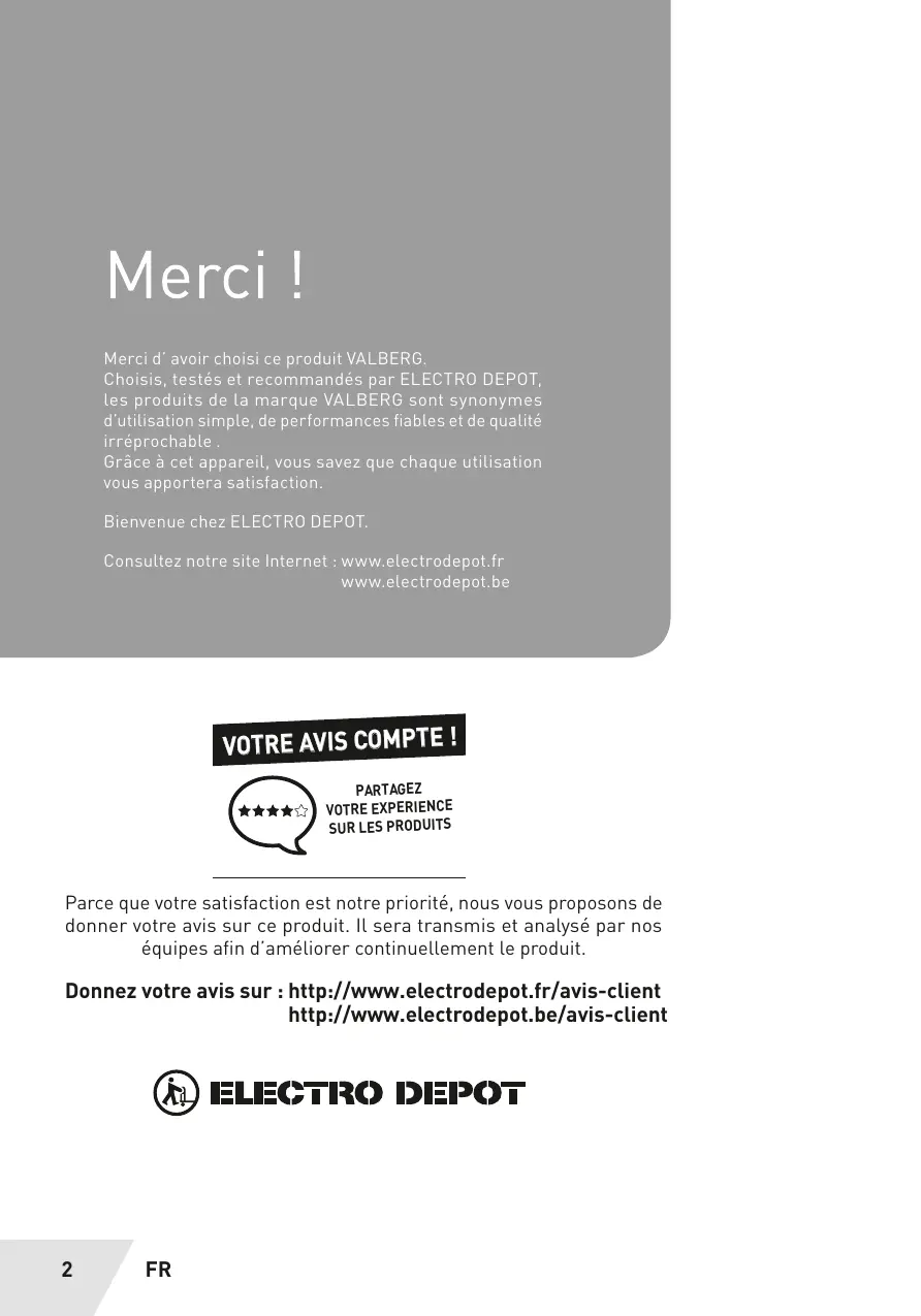 Merci d'avoir choisi ce produit VALBERG Choisis, testés et recommandés par ELECTRO DEPO Les produits de La marque VALBERG sont synonym: d'utilisation simple, de performances fiables et de quali irréprochable