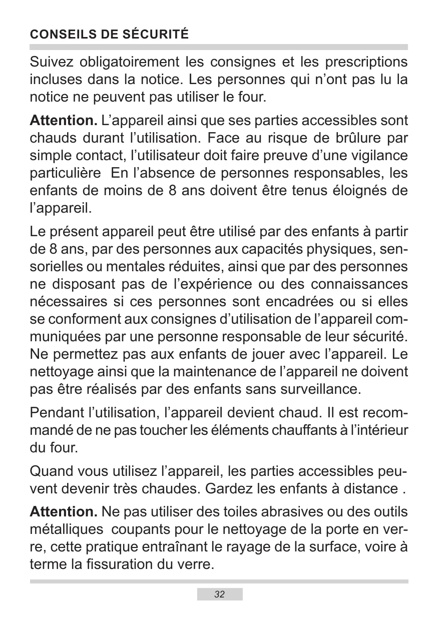 Attention. L'appareil ainsi que ses parties accessibles sont chauds durant l’utilisation. Face au risque de brûlure par simple contact, l'utilisateur doit faire preuve d’une vigilance particulière En l'absence de personnes responsables, les enfants de moins de 8 ans doivent être tenus éloignés de l'appareil.