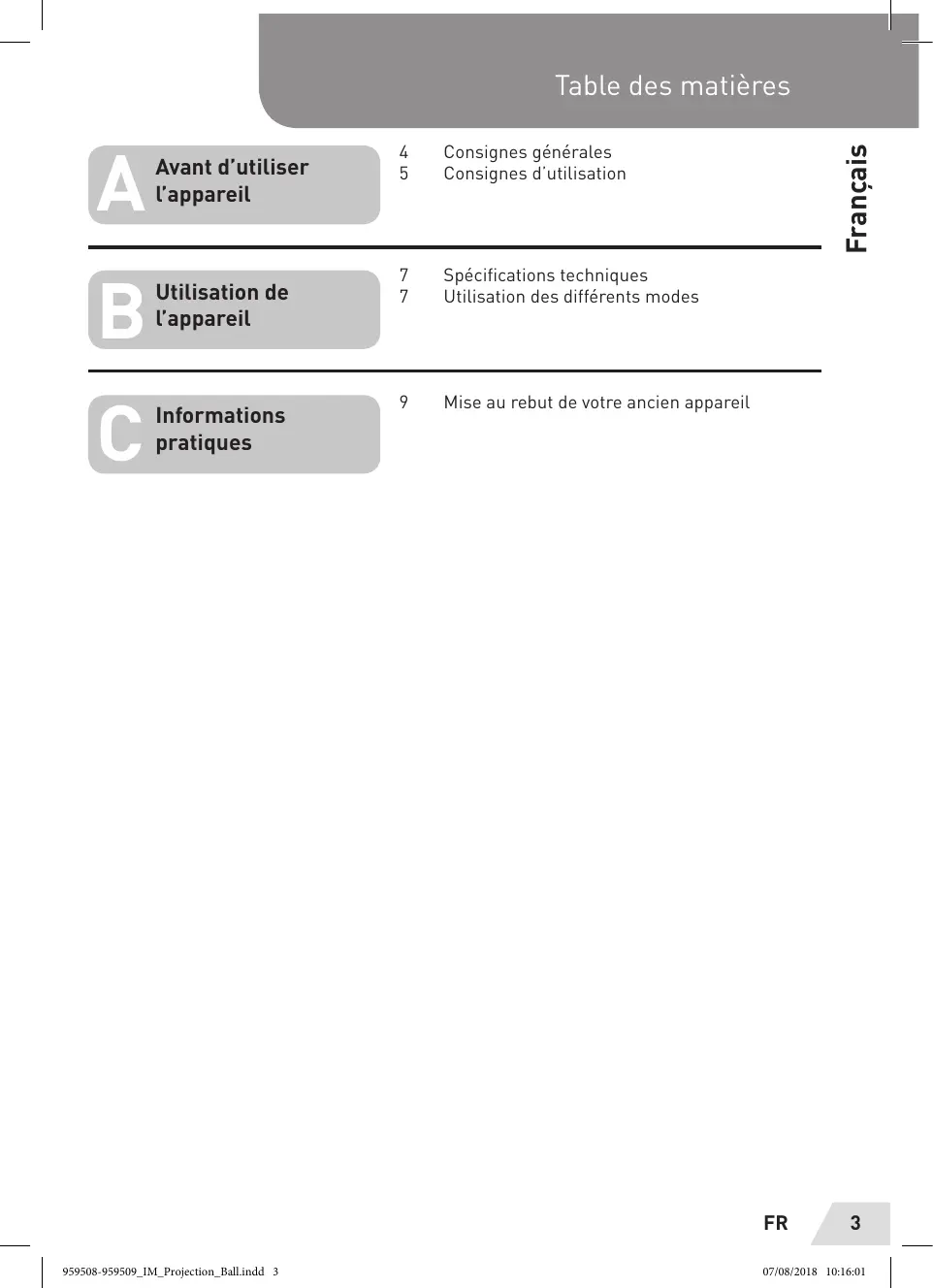 Ne 7 Spécifications techniques Utilisation de 7 Utilisation des différents modes l'appareil Momo 9 Mise au rebut de votre ancien appareil pratiques FR 3 959508-959509_1M Projection Ballindd 3 O7108/2018 10:16:01