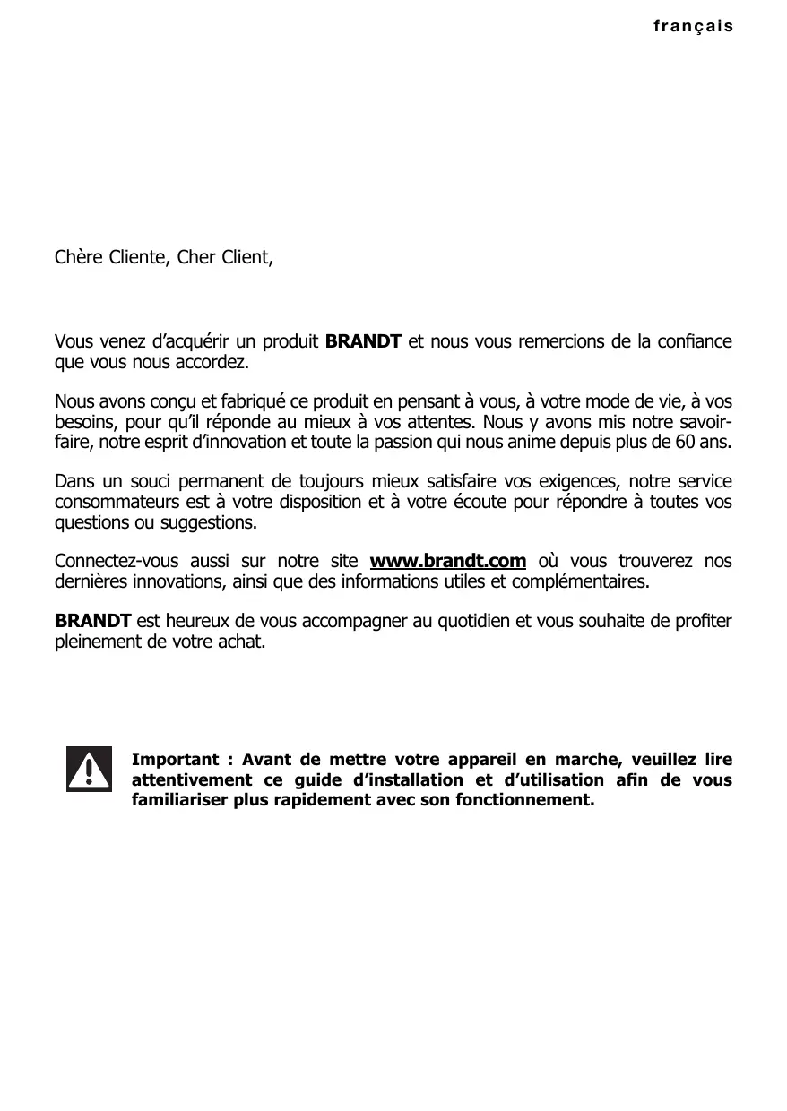 français Chère Cliente, Cher Client, Vous venez d'acquérir un produit BRANDT et nous vous remercions de la confiance que vous nous accordez. Nous avons conçu et fabriqué ce produit en pensant à vous, à votre mode de vie, à vos besoins, pour qu'il réponde au mieux à vos attentes. Nous y avons mis notre savoir- faire, notre esprit d'innovation et toute la passion qui nous anime depuis plus de 60 ans. Dans un souci permanent de toujours mieux satisfaire vos exigences, notre service consommateurs est à votre disposition et à votre écoute pour répondre à toutes vos questions ou suggestions. Connectez-vous aussi sur notre site www.brandt.com où vous trouverez nos dernières innovations, ainsi que des informations utiles et complémentaires. BRANDT est heureux de vous accompagner au quotidien et vous souhaite de profiter pleinement de votre achat. Important : Avant de mettre votre appareil en marche, veuillez lire attentivement ce guide d'installation et d'utilisation afin de vous familiariser plus rapidement avec son fonctionnement.