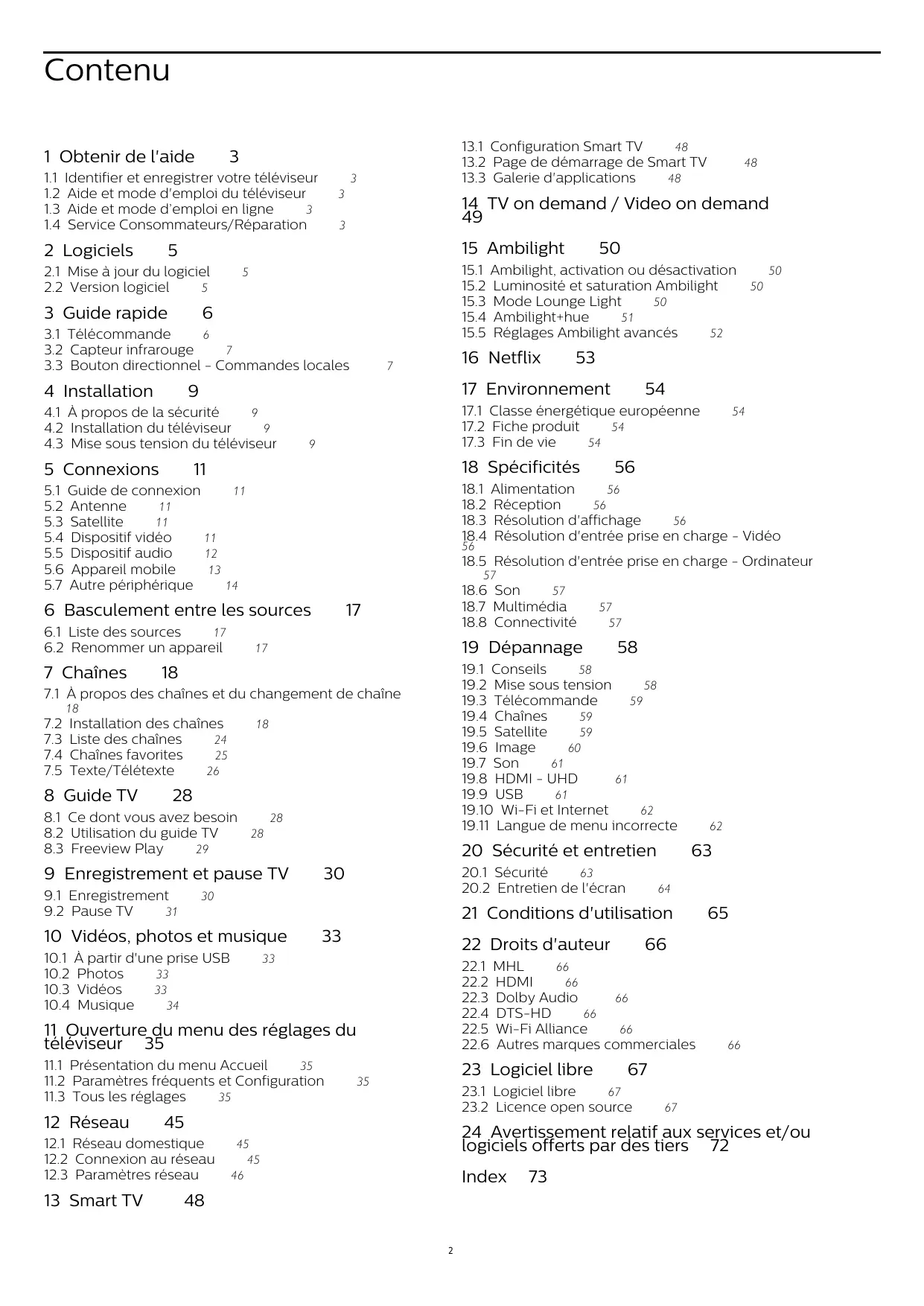 Contenu 1 Obtenir de l'aide 3 11 Identifier et enregistrer votre téléviseur 3 12 Aide et mode d'emploi du téléviseur 3 13 Aide et mode d'emploi en ligne 3 14 Service Consommateurs/Réparation 3 2 Logiciels 5 21 Mise à jour du logiciel 5 22 Version logiciel 5 3 Guide rapide 6 31 Télécommande é