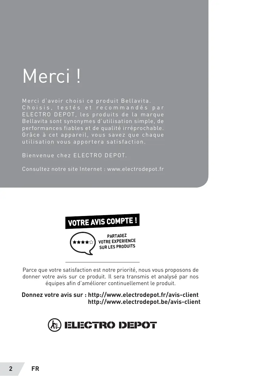 Merci | Merci d'avoir choisi ce produit Bellavita Choisis, testés et recommandés par ELECTRO DEPOT, Les produits de La marque Bellavita sont synonymes d'utilisation simple, de performances fiables et de qualité irréprochable. Grâce à cet appareil, vous savez que chaque utilisation vous apportera satisfaction. Bienvenue chez ELECTRO DEPOT. Consultez notre site Internet : www.electrodepot.fr VOTRE AVIS COMPTE ! PARTAGEZ VOTRE EXPERIENCE
