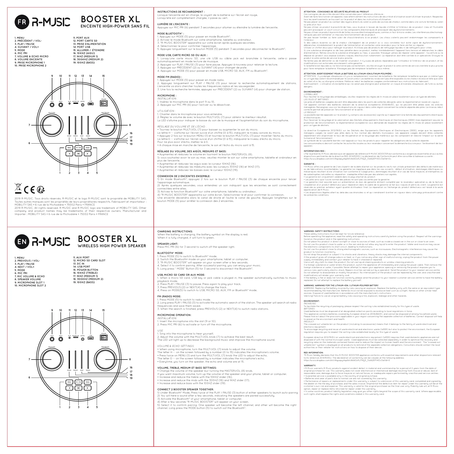 s Ê Êce& 2019 #-MUSIC. Tous droits réservés. R-MUSIC et le logo A-MUSIC sont la propriété de MOBILITY SAS. Teules autres marques san! les praprièlés de laure propriétaires respectifs. Fabriquant el importateur MOBILITY SAS + 6 rue de la Michogière + 75002 Paris » FRANCE 2019 R-MUSIC. Al rights reserved. R-MUSIC and R-MUSIC loge are trademark of MOBILITY SAS. Other <ompany and produel names may be trademarks of their respective owners. Manulacturer and Importer: MOBILITY SAS + 6 rue de la Michadhäre + 75002 Paris + FRANCE INSTRUCTIONS DE RECHARGEMENT : Lorsque l'enceinte esl en charge, le voyant de la ballerie sur l'écran est rouge. Lorsqu'elle est complétement chargée, passe au vert LUMIÈRE DE L'ENCEINTE : Appuyez sur MIC PRI (6) pendant 3 secondes pour allumer ou éleindre la lumière de l'enceinte. MODE BLUETOOTH: 1 Appuyez sur MODE (5) pour passer an made Bluetooth"