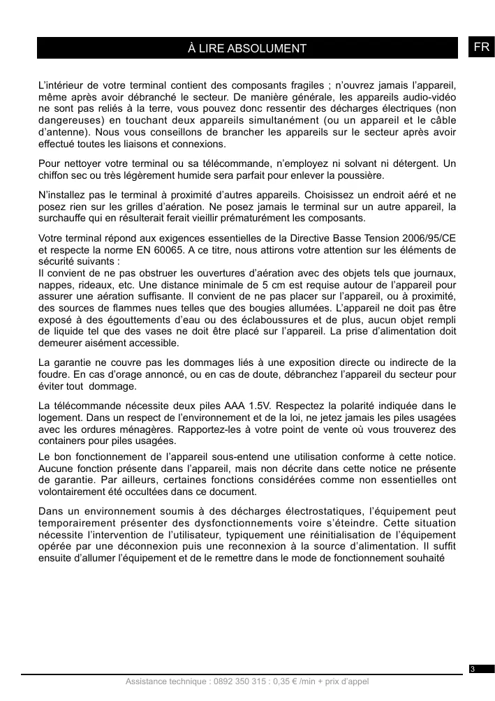 La garantie ne couvre pas les dommages liés à une exposition directe ou indirecte de la foudre. En cas d'orage annoncé, ou en cas de doute, débranchez l'appareil du secteur pour