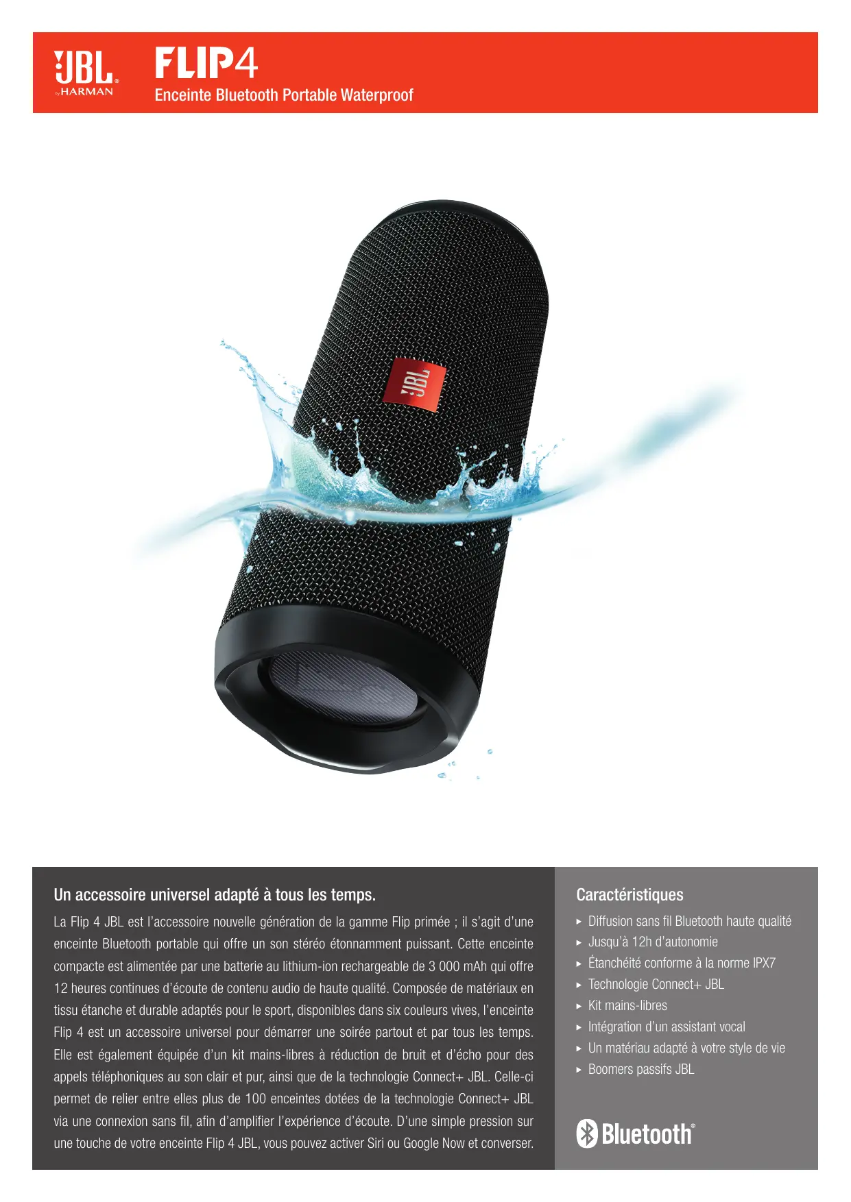 appels tél ir € 1] technologie Connect+ JBL. Celle-ci permet de relier entre elles plus de 100 enceintes dotées de la technologie Connect+ JBL via une connexion sans fil, afin d'amplifier l'expérience d'écoute. D'une simple pression sur une touche de votre enceinte Flip 4 JBL, vous pouvez activer Siri ou Google Now et converser