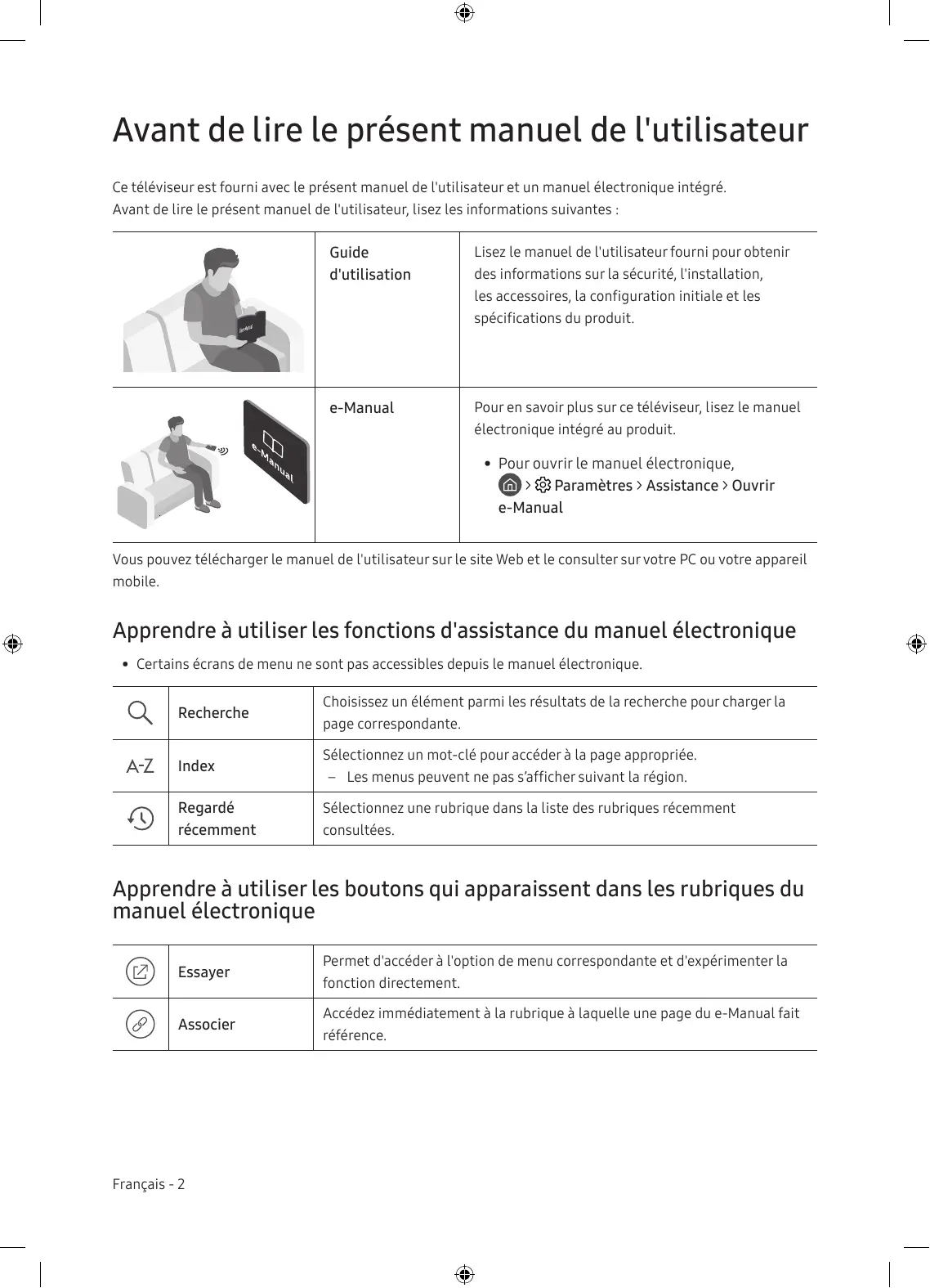 + Pour ouvrir le manuel électronique, © > & Paramètres > Assistance > Ouvrir e-Manual Vous pouvez télécharger le manuel de l'utilisateur sur Le site Web et Le consulter sur votre PC ou votre appareil mobile. Apprendre à utiliser Les fonctions d'assistance du manuel électronique + Certains écrans de menu ne sont pas accessibles depuis le manuel électronique. Choisissez un élément parmi Les résultats de La recherche pour charger la A Recherche page correspondante. Sélectionnez un mot-clé pour accéder à La page appropriée. AZ | Index P ee Page epprop — Les menus peuvent ne pas s'afficher suivant La région. ro] Regardé Sélectionnez une rubrique dans la liste des rubriques récemment récemment consultées. Apprendre à utiliser Les boutons qui apparaissent dans les rubriques du manuel électronique (@) E Permet d'accéder à l'option de menu correspondante et d'expérimenter La ssayer » fonction directement. . Accédez immédiatement à La rubrique à laquelle une page du e-Manual fait @ Associer PA référence. Français - 2