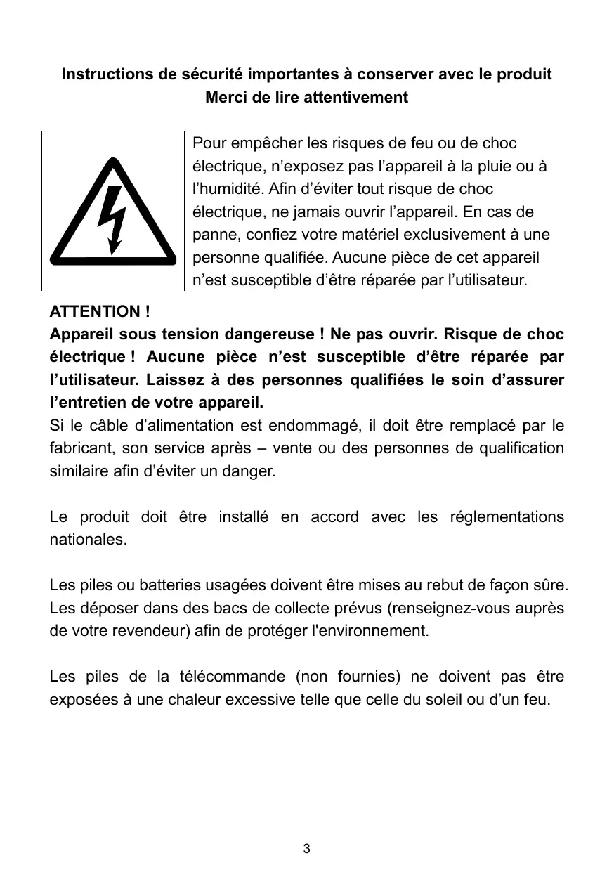 Instructions de sécurité importantes à conserver avec le produit Merci de lire attentivement Pour empêcher les risques de feu ou de choc électrique, n’exposez pas l'appareil à la pluie ou à l'humidité. Afin d'éviter tout risque de choc électrique, ne jamais ouvrir l'appareil. En cas de panne, confiez votre matériel exclusivement à une personne qualifiée. Aucune pièce de cet appareil n'est susceptible d'être réparée par l'utilisateur. ATTENTION ! Appareil sous tension dangereuse ! Ne pas ouvrir. Risque de choc électrique ! Aucune pièce n’est susceptible d’être réparée par l'utilisateur. Laissez à des personnes qualifiées le soin d'assurer l'entretien de votre appareil. Si le câble d'alimentation est endommagé, il doit être remplacé par le fabricant, son service après — vente ou des personnes de qualification similaire afin d'éviter un danger. Le produit doit être installé en accord avec les réglementations nationales. Les piles ou batteries usagées doivent être mises au rebut de façon sûre. Les déposer dans des bacs de collecte prévus (renseignez-vous auprès de votre revendeur) afin de protéger l'environnement. Les piles de la télécommande (non fournies) ne doivent pas être exposées à une chaleur excessive telle que celle du soleil ou d’un feu.