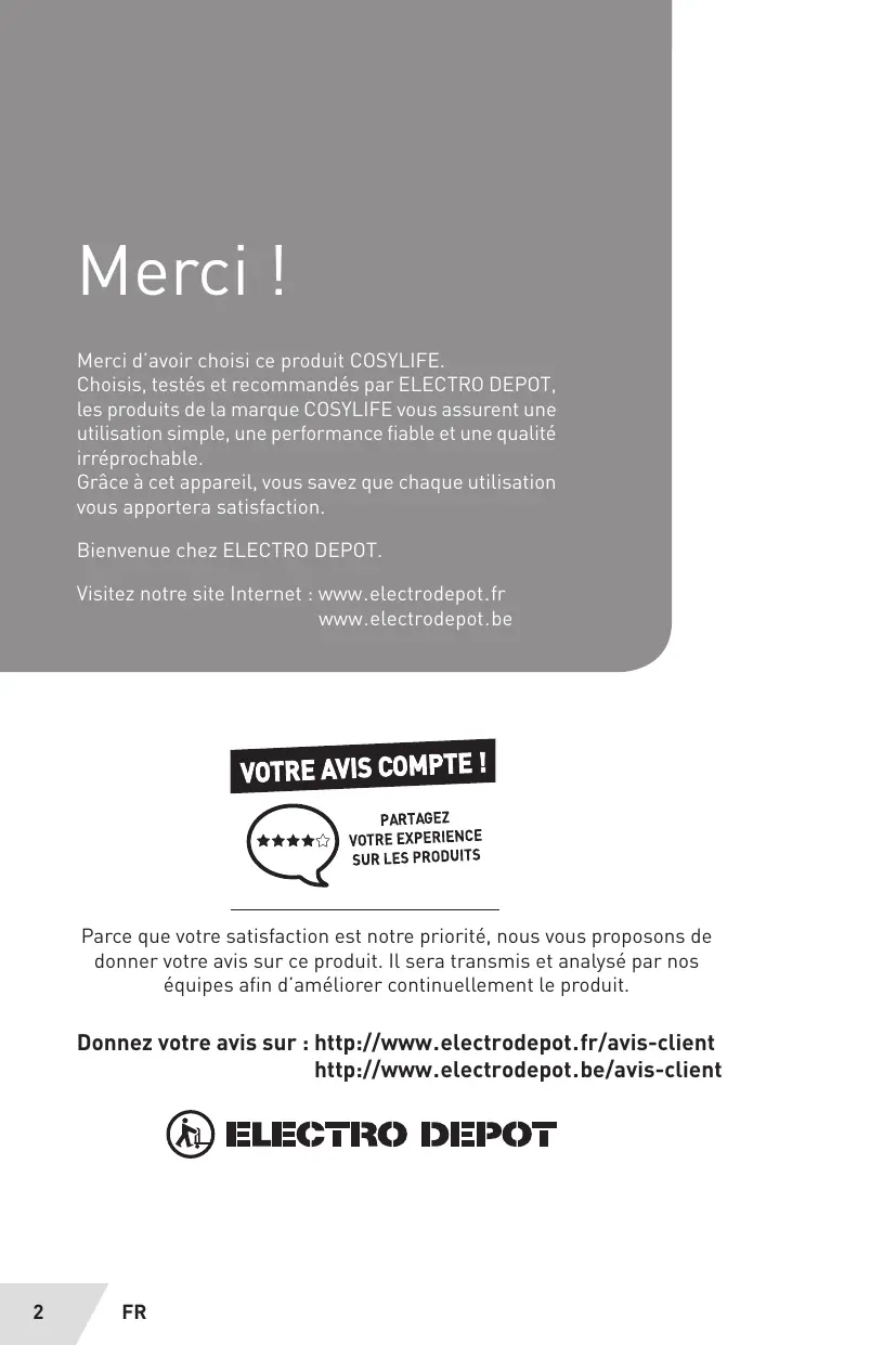 Merci | Merci d'avoir choisi ce produit COSYLIFE. Choisis, testés et recommandés par ELECTRO DEPOT, les produits de La marque COSYLIFE vous assurent une utilisation simple, une performance fiable et une qualité irréprochable. Grâce à cet appareil, vous savez que chaque utilisation vous apportera satisfaction. Bienvenue chez ELECTRO DEPOT Visitez notre site Internet : www.electrodepot.fr www.electrodepot.be