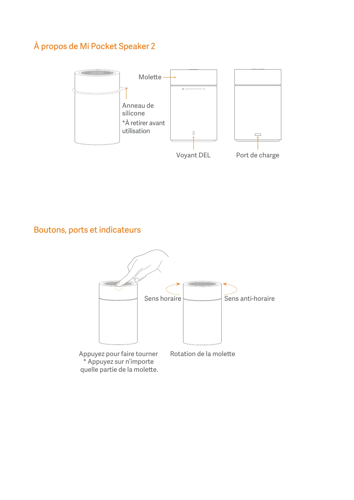 À propos de Mi Pocket Speaker 2 Molette —+ Anneau de silicone *À retirer avant utilisation 0 = T ———— Voyant DEL Port de charge Boutons, ports et indicateurs
