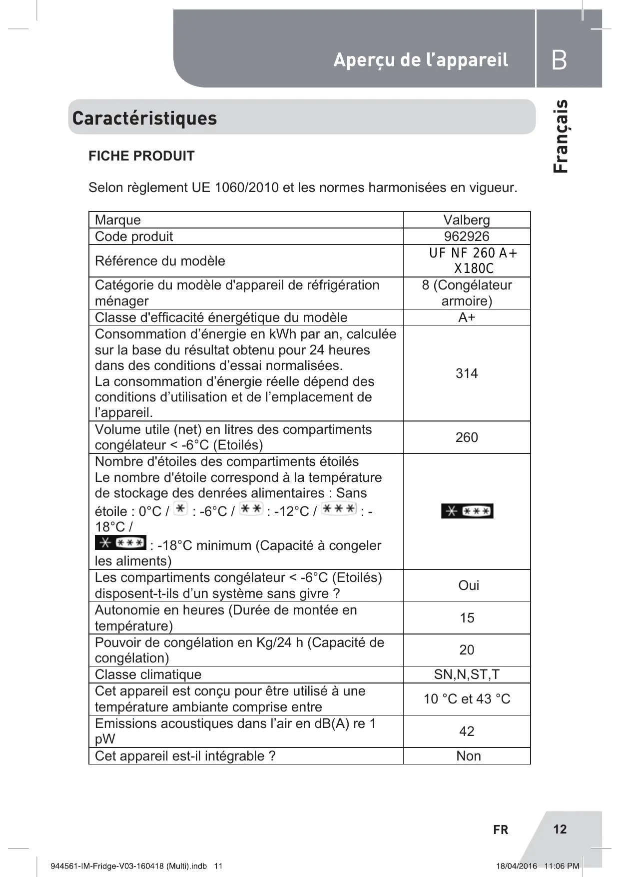 Retrouvez gratuitement la notice de l'appareil UF NF 260 A+ X180C VALBERG au format PDF.
