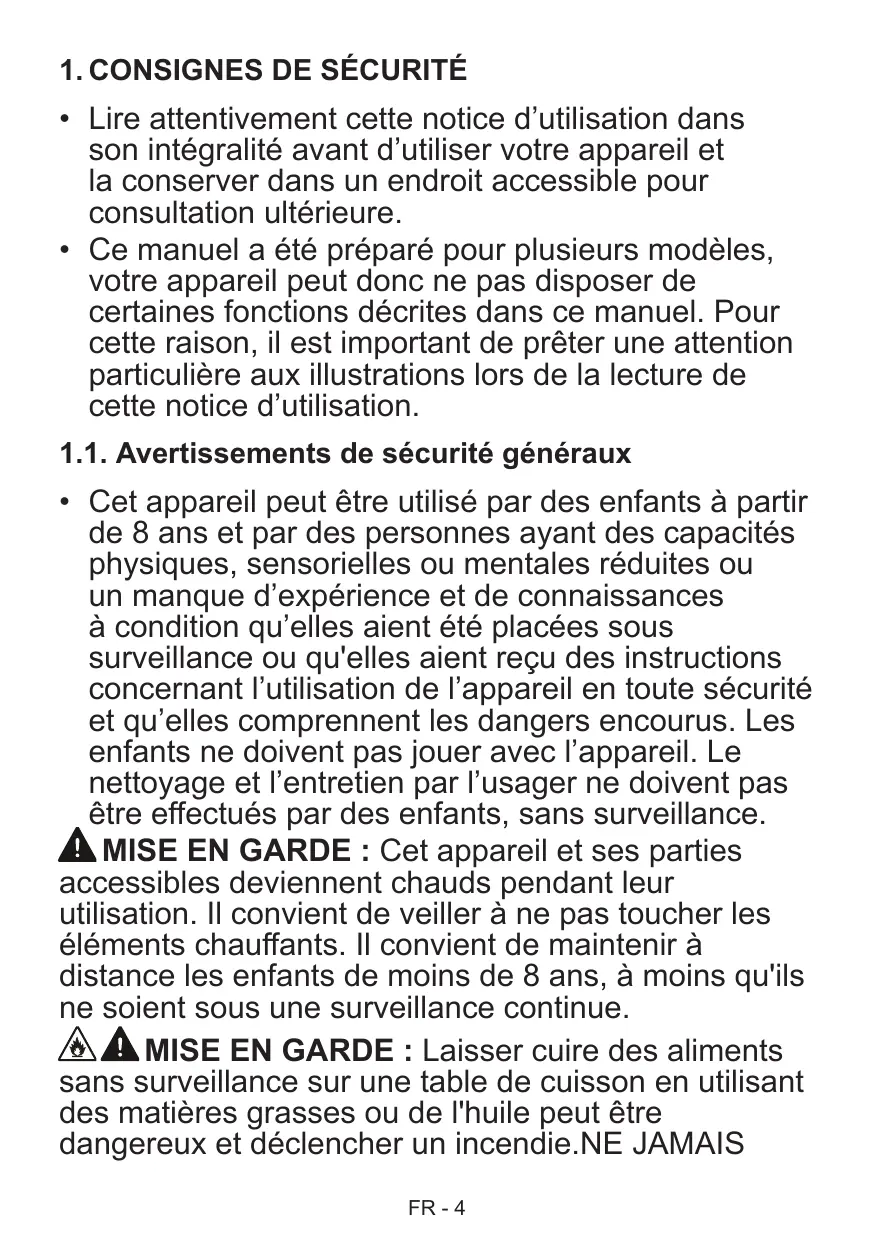 A ATTENTION : Cet appareil sert uniquement à des fins de cuisson et est destiné uniquement à un usage domestique. Il ne doit pas être utilisé à d’autres fins, par exemple le chauffage du local, ou un usage commercial.