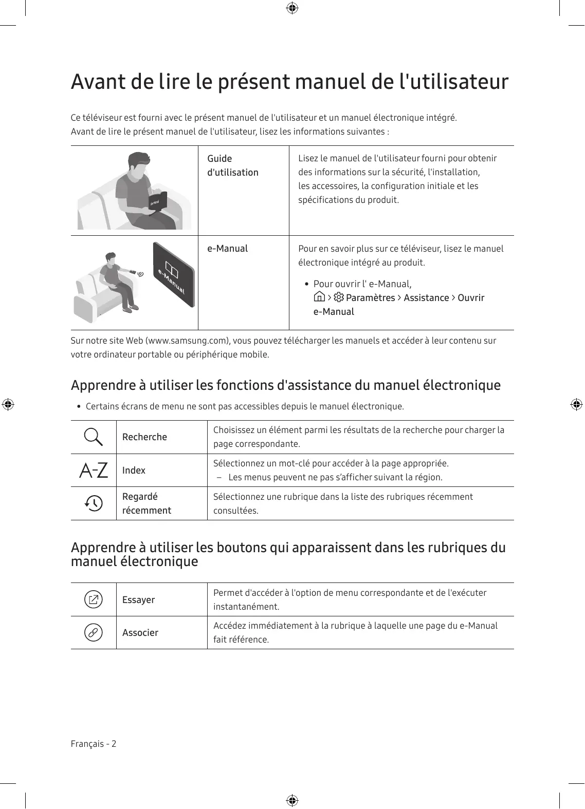 + Pour ouvrir l'e-Manual, (À > & Paramètres > Assistance > Ouvrir e-Manual Sur notre site Web (www.samsung.com), vous pouvez télécharger Les manuels et accéder à leur contenu sur votre ordinateur portable ou périphérique mobile. Apprendre à utiliser Les fonctions d'assistance du manuel électronique + Certains écrans de menu ne sont pas accessibles depuis le manuel électronique. Choisissez un élément parmi Les résultats de La recherche pour charger la Q Recherche page correspondante. À 7 ind Sélectionnez un mot-clé pour accéder à la page appropriée. = ndex so — Les menus peuvent ne pas s'afficher suivant La région. D Regardé Sélectionnez une rubrique dans la liste des rubriques récemment récemment consultées. Apprendre à utiliser Les boutons qui apparaissent dans les rubriques du manuel électronique Permet d'accéder à l'option de menu correspondante et de l'exécuter Essayer : & instantanément. : Accédez immédiatement à La rubrique à laquelle une page du e-Manual @) Associer Le été fait référence. Français - 2