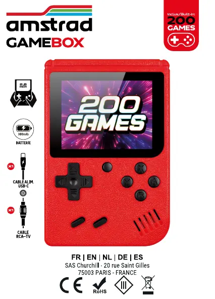 SO nul Be RER Do om hat opt 5 ta un pat gt ana «para para sn ag 20 CHURCHILL Déclaration UE de Conformité Nous, SAS CHURCHILL, 20 rue St Gilles - 75008 Paris France Cetiions et déciarons sous notre seule responsabilité que le produit suivant : Certfy and declare under our sol responsbit oniy the folawing products: 1 Brand: AMSTRAD “Type ou modèle | Type or model : AMS-GAMEBOX “Type modèle usine Factory model number : VW.403 Désignation commerciale | Designation : Console de jeux Estconfome à la directive Is comples win he retro