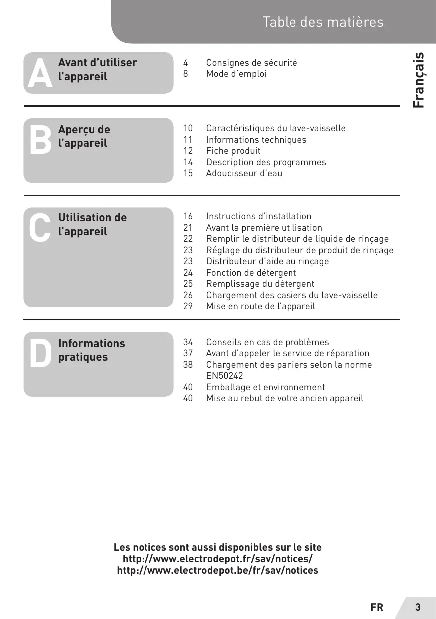15 Adoucisseur d'eau Utilisation de 16 Instructions d'installation Bert 21 Avant la première utilisation | pp 22. Remplir le distributeur de liquide de rinçage 23 Réglage du distributeur de produit de rinçage 23 Distributeur d'aide au rinçage 24 Fonction de détergent 25 Remplissage du détergent 26 Chargement des casiers du lave-vaisselle 29 Mise en route de l'appareil Informations 34 Conseils en cas de problèmes pratiques 37 Avant d'appeler le service de réparation 38 Chargement des paniers selon La norme EN50242 40 Emballage et environnement 40 Mise au rebut de votre ancien appareil Les notices sont aussi disponibles sur Le site http://www.electrodepot.fr/sav/notices/ http://www.electrodepot.be/fr/sav/notices FR 3